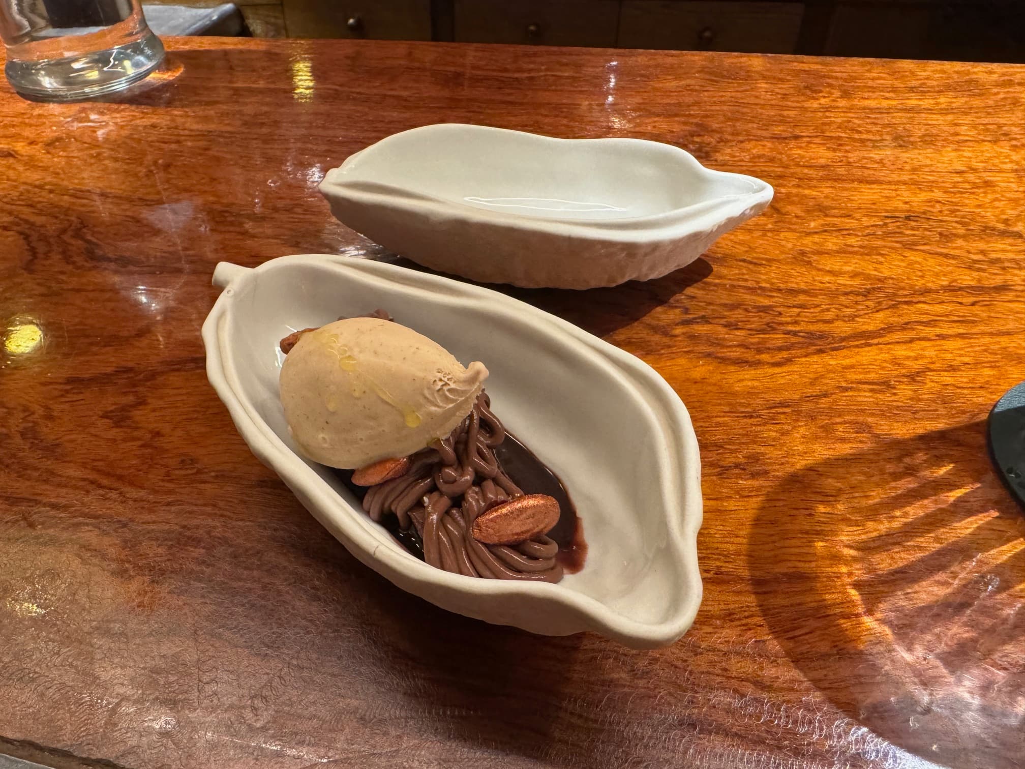 Hazelnut and choc dessert - Served inside a coffee bean shaped plate. Simple all considering but still felt proper.