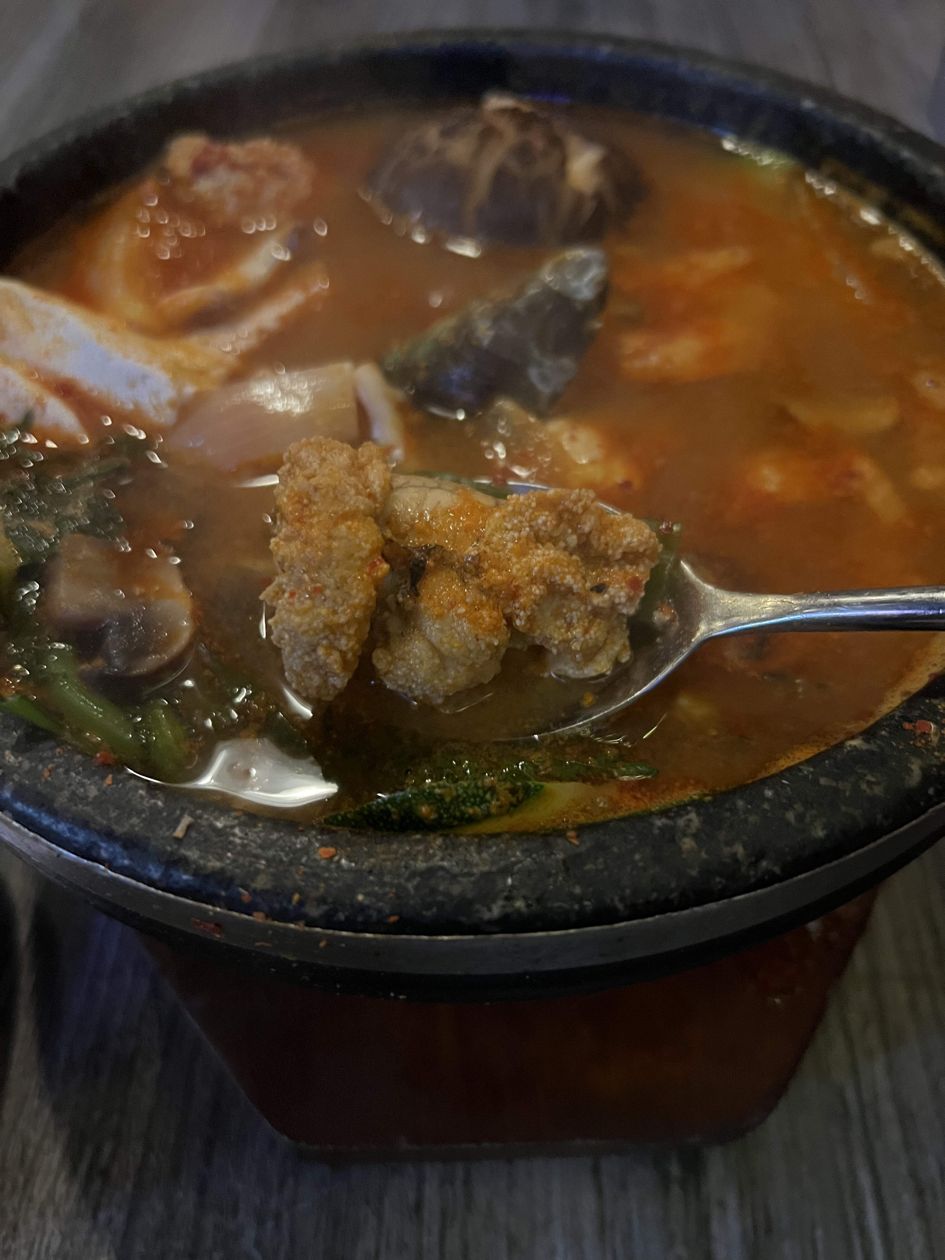 Spicy soft tofu stew with beef and seafood