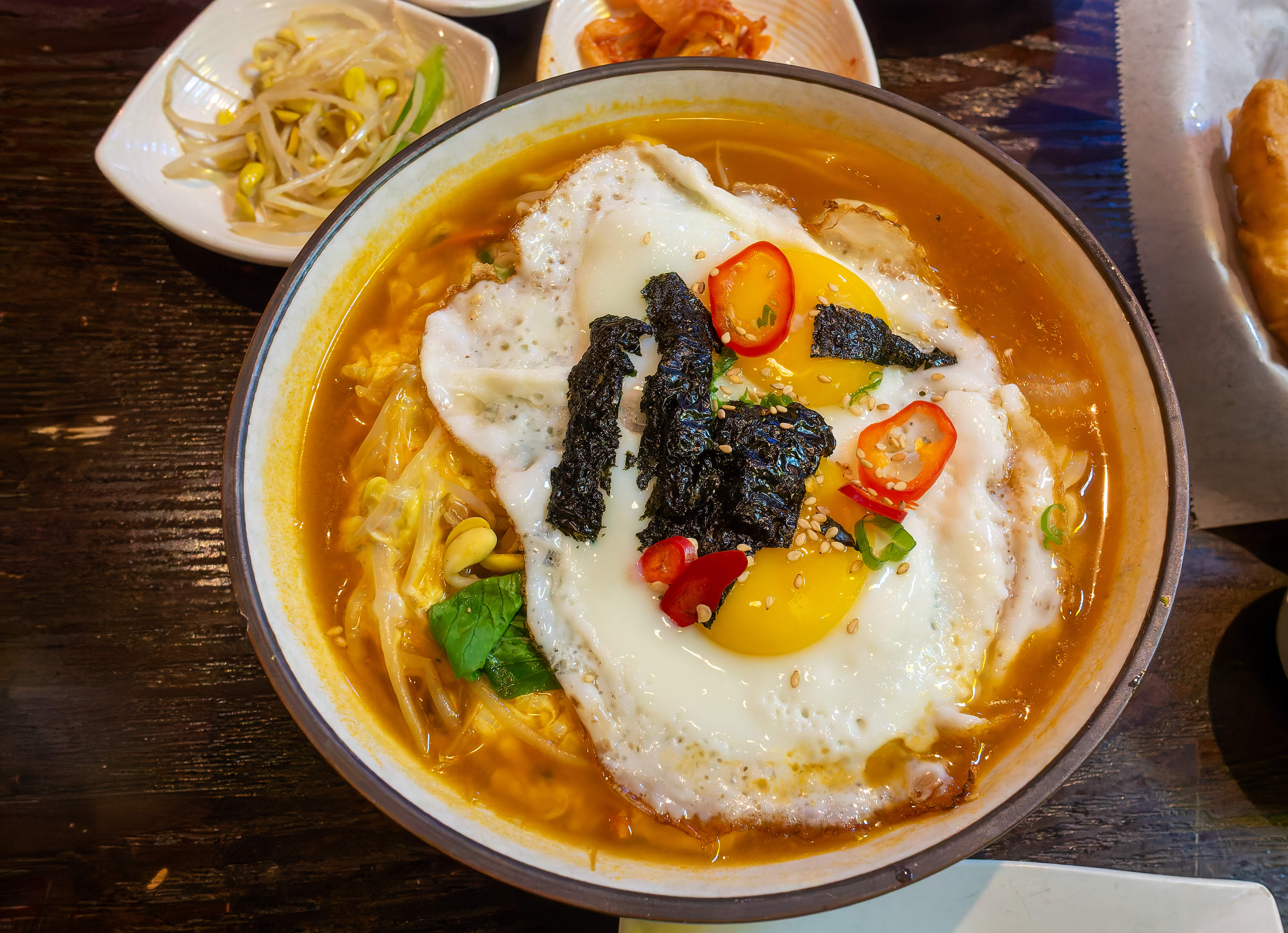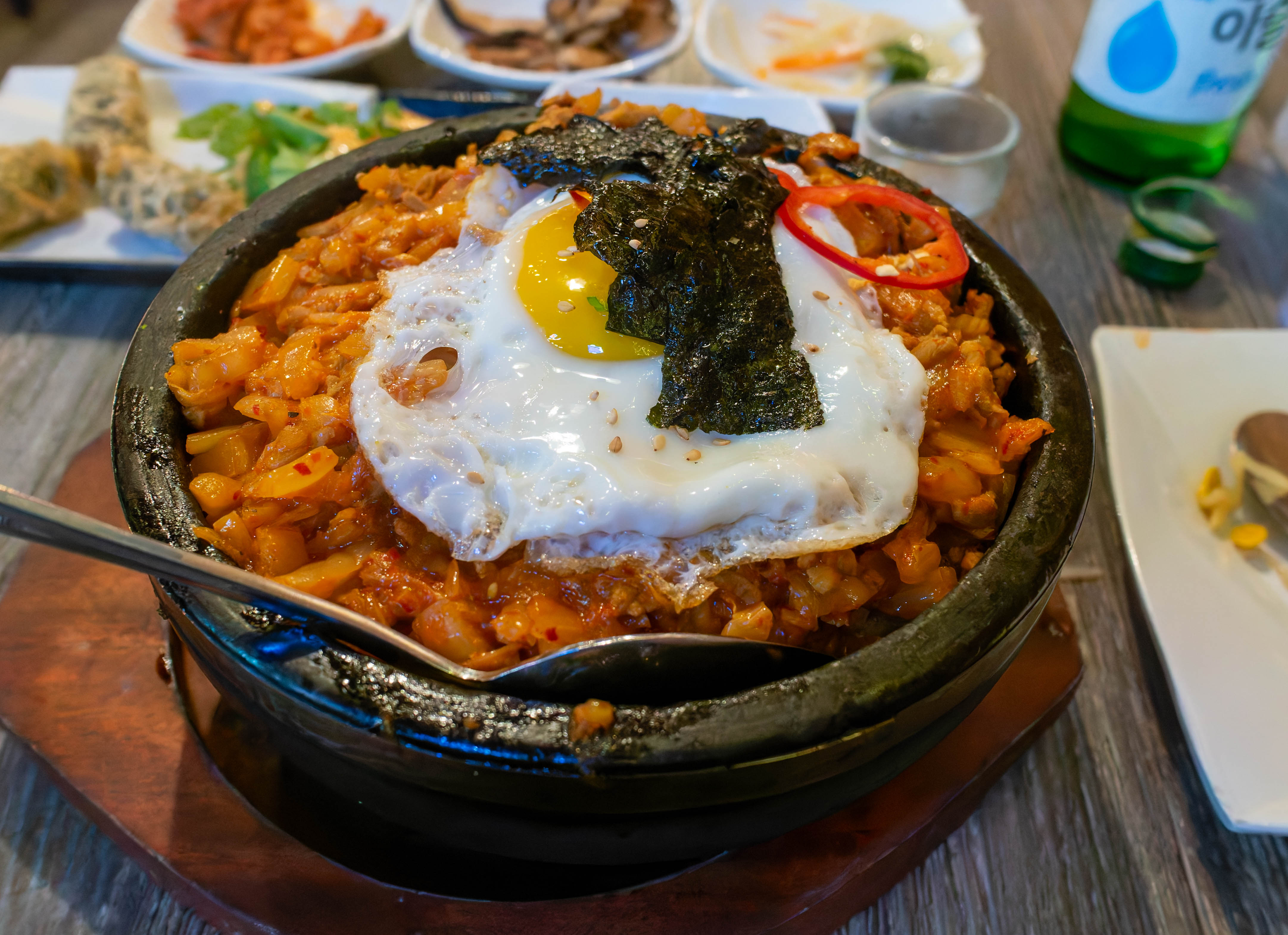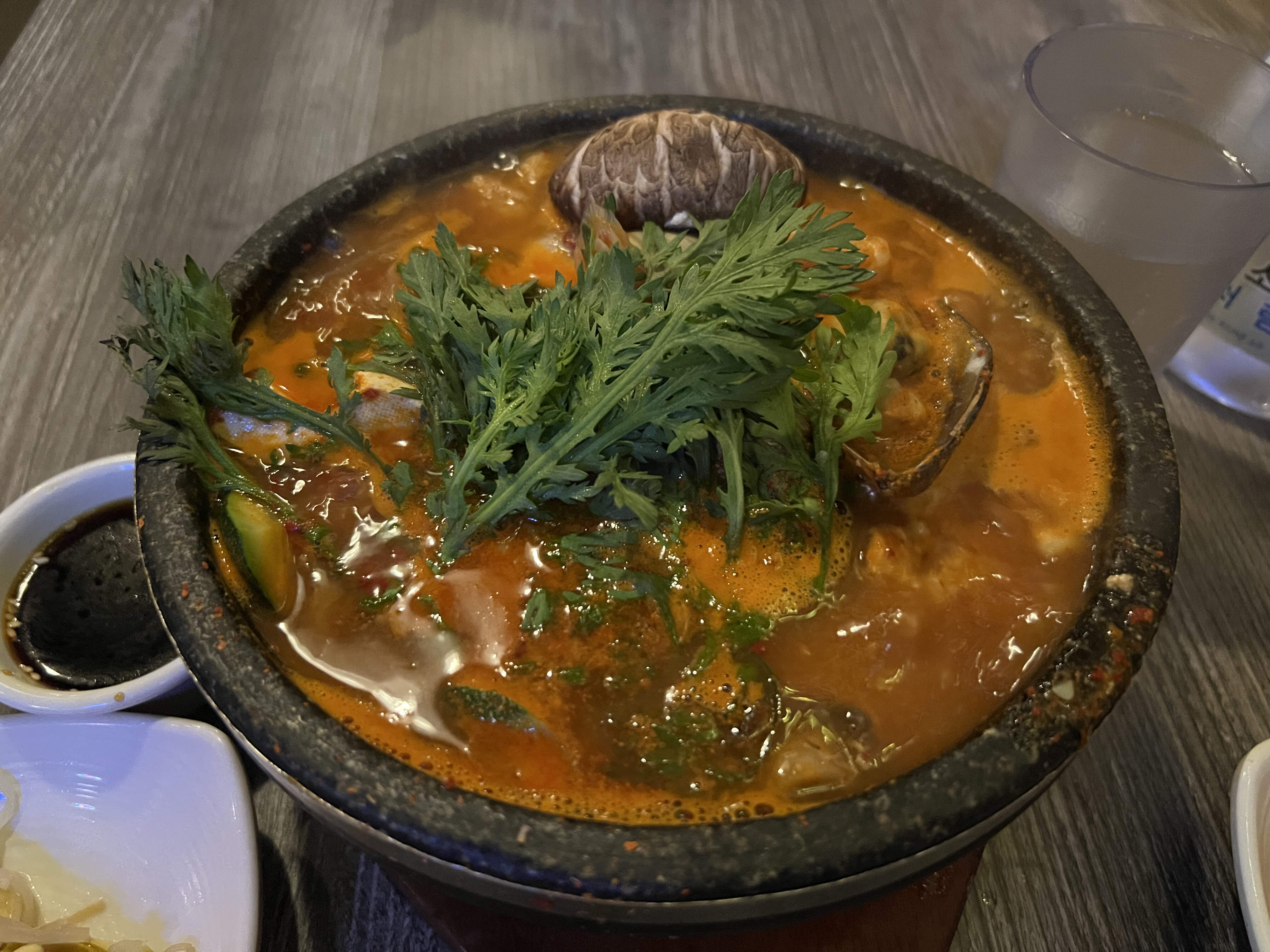 On my most recent visit on Sunday, I pigged out a bit. I had the soondubu jjigae, which was quite good and had a lot of beef - which was ground I believe - and seafood, which included medium sized tail-on shrimp and lots of clams.