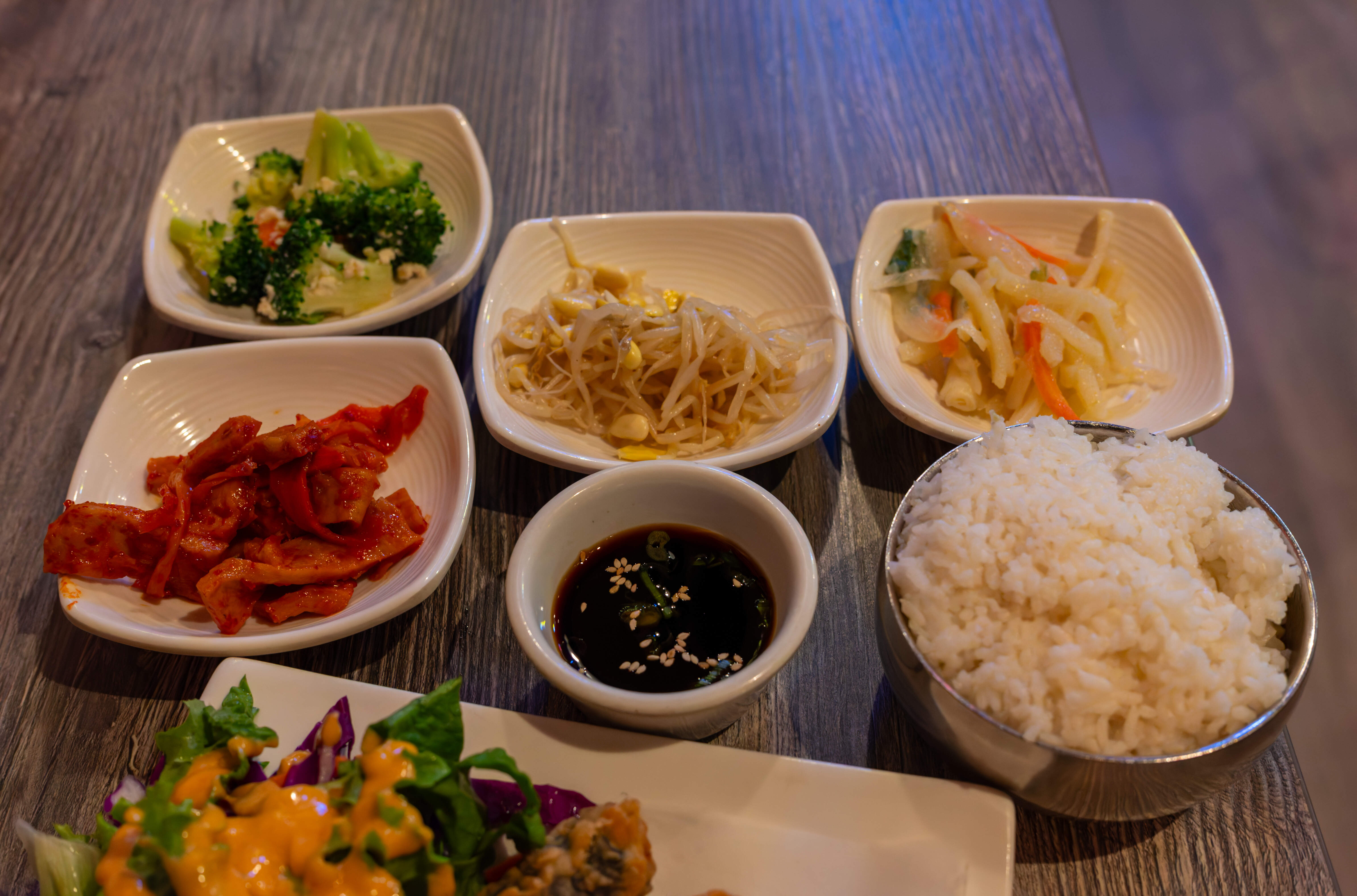 Banchan - mushrooms, danmuji, bean sprouts, broccoli.