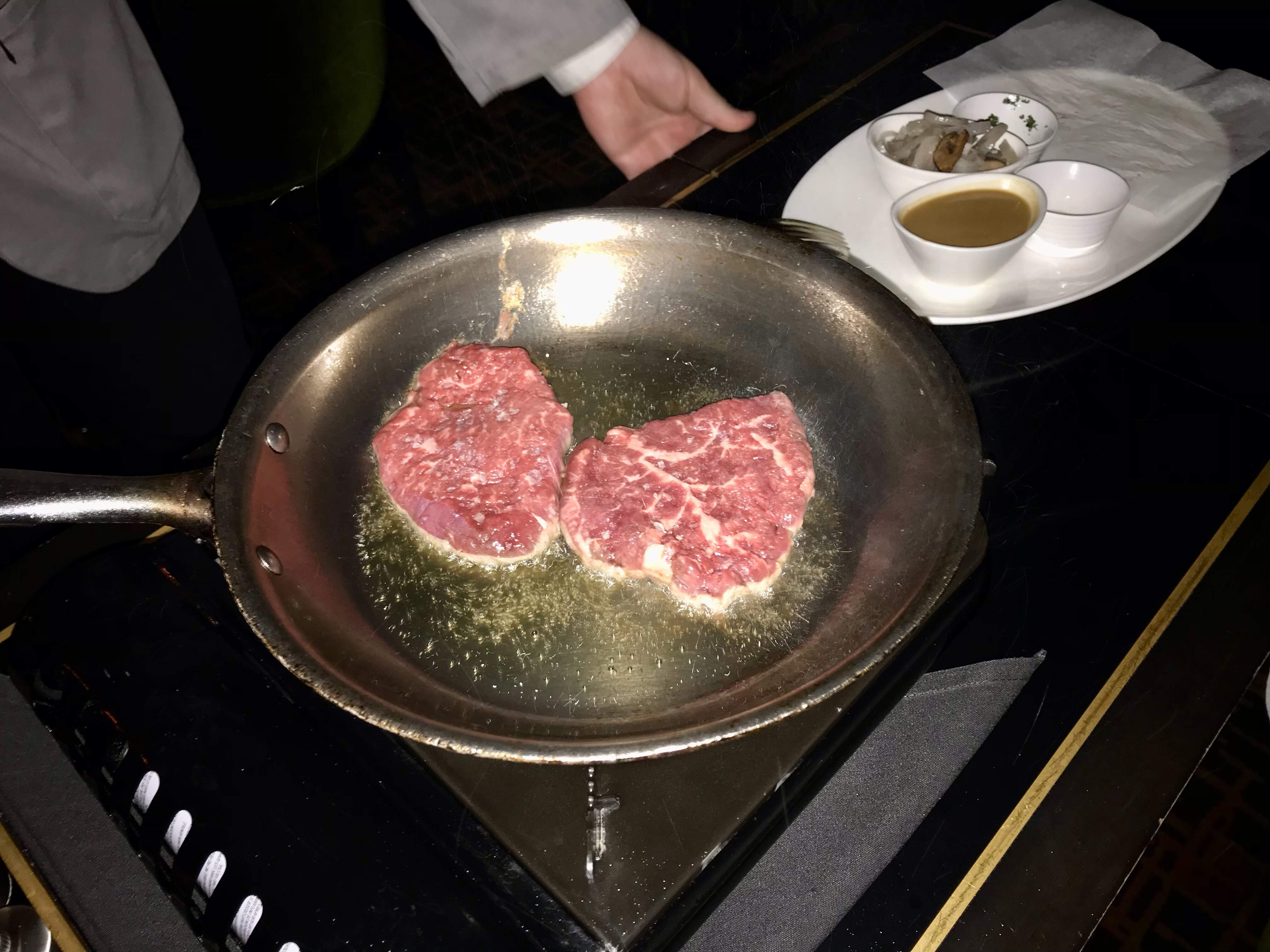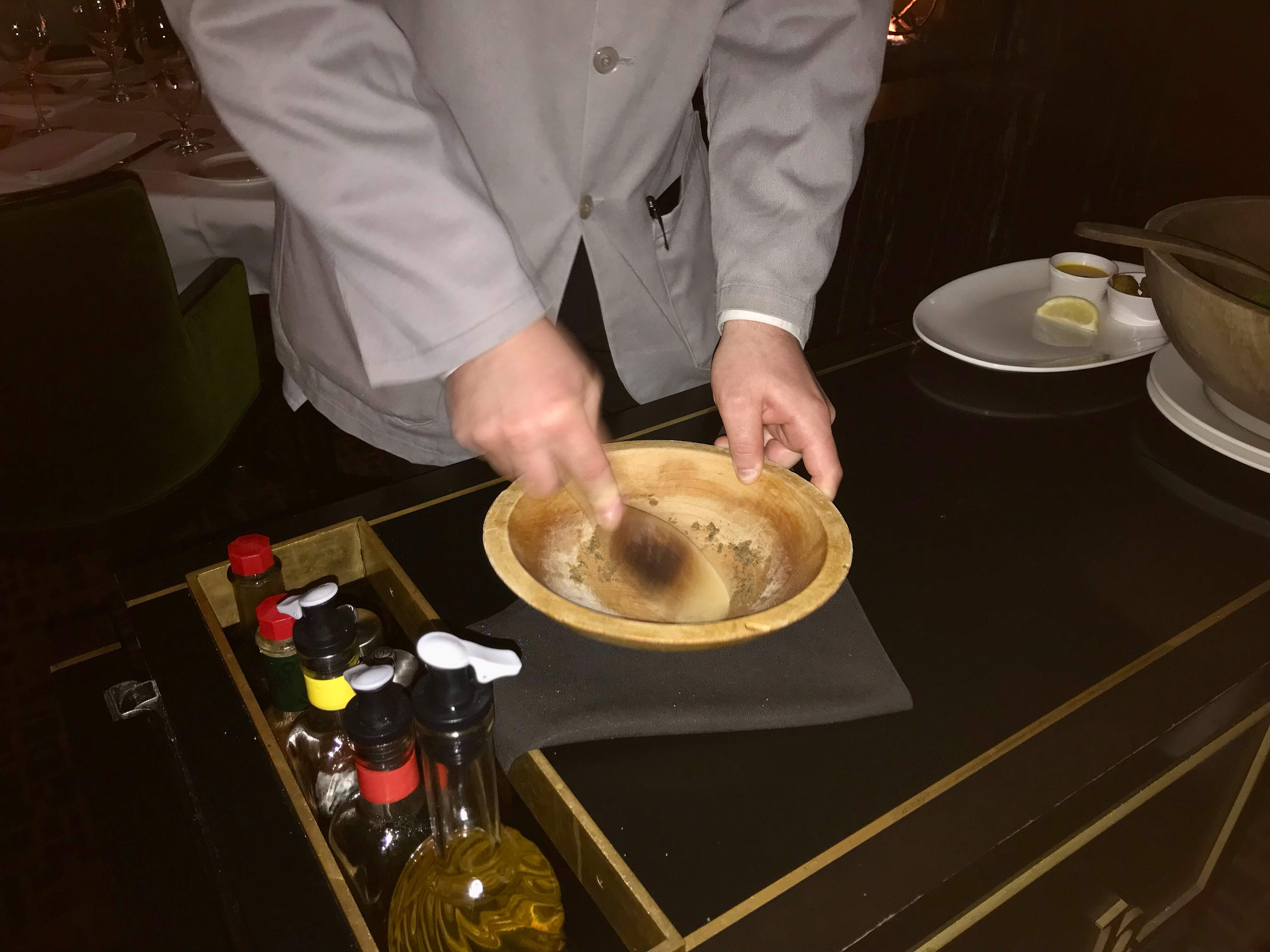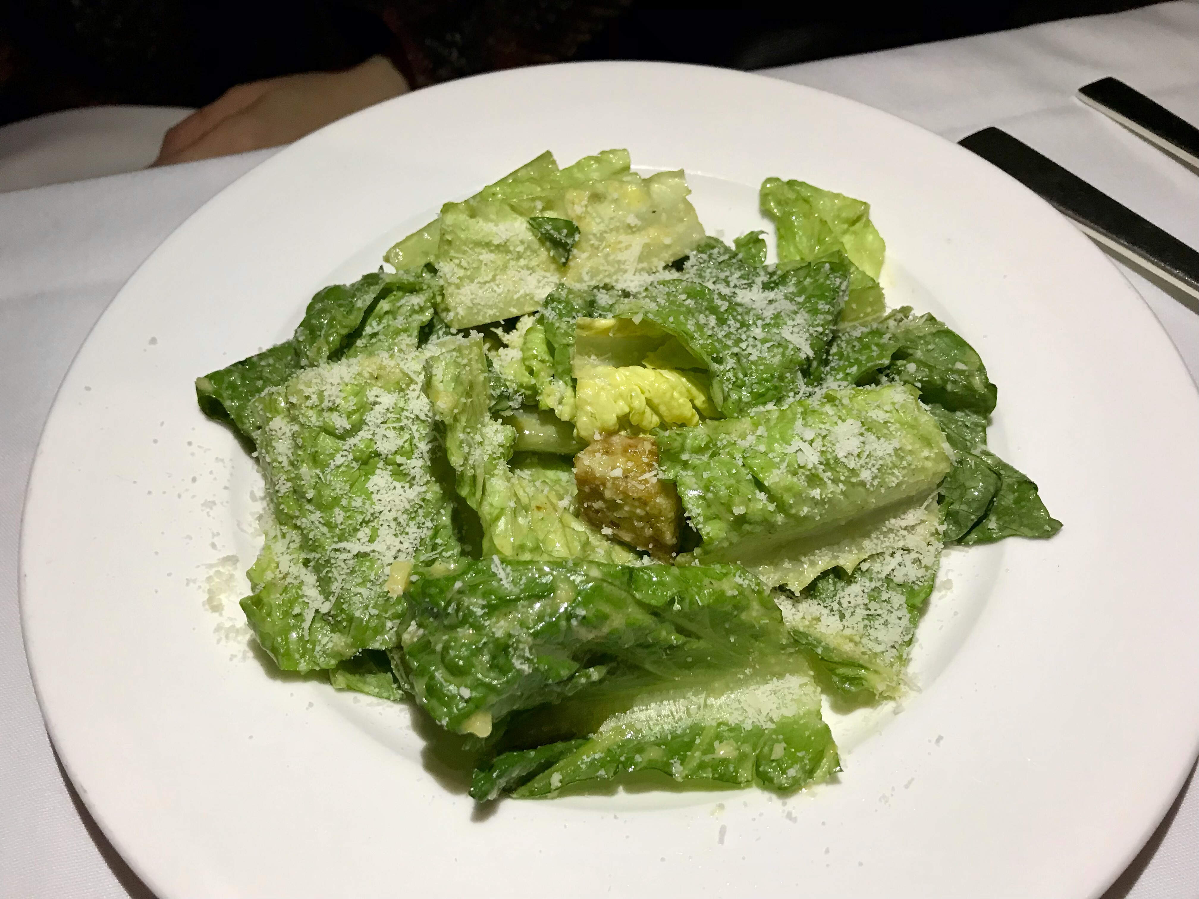 Of course we had to order some of the dishes prepared tableside, starting with their Caesar: crisp romaine dressed with garlic, anchovy, egg yolk, Dijon, lemon juice, Tabasco, parmesan, olive oil, and black pepper, plus buttery croutons. No bacon (maybe because Hy was of Russian Jewish background).