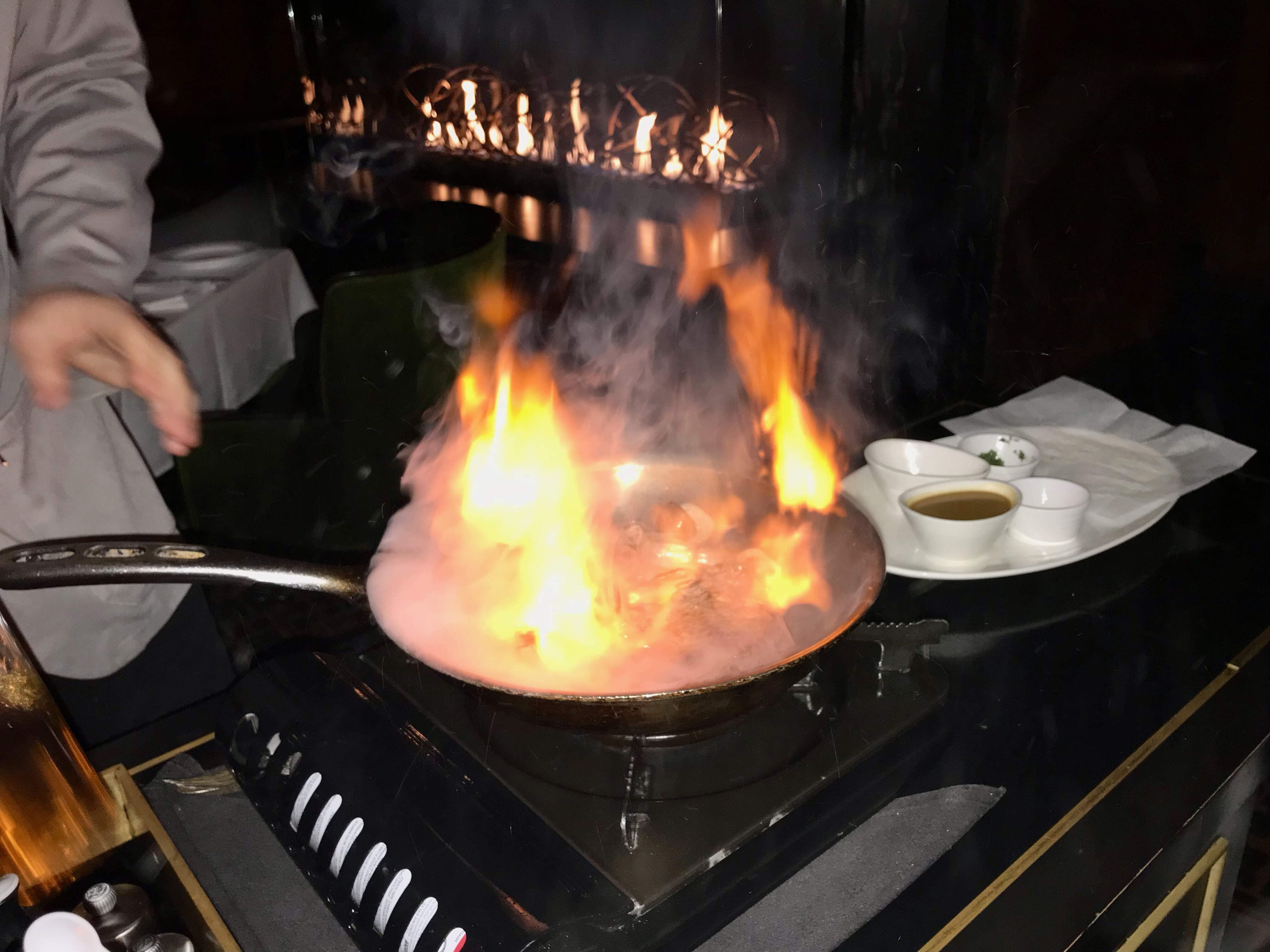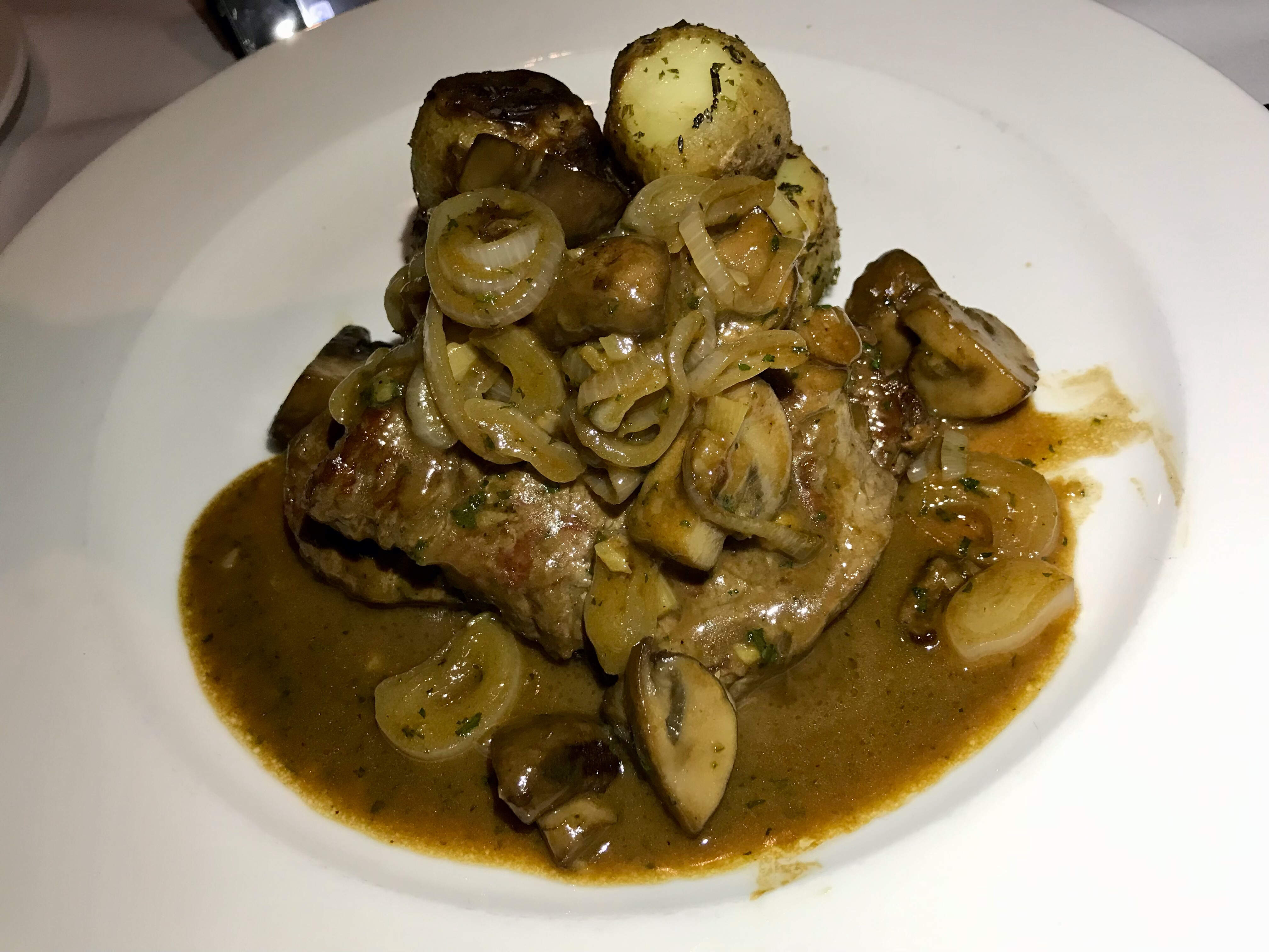 Our next tableside preparation was the Steak Diane: thin beef tenderloins, cooked in clarified butter, then flambeed with brandy, Dijon mustard, fresh mushrooms, and shallots, served with green beans and roasted potatoes. Delicious and very rich.