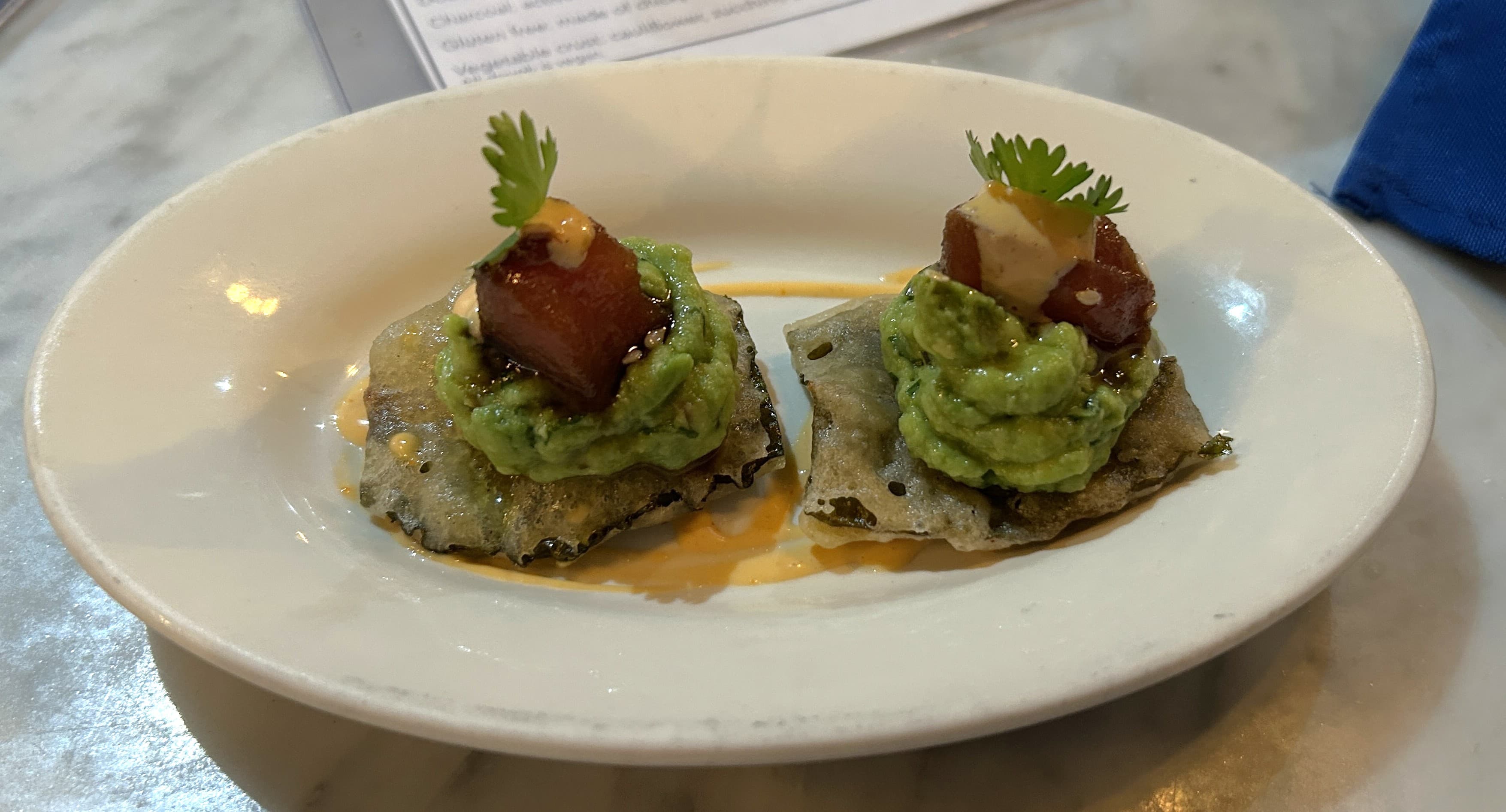 The first was a kale chip (I ordered two of these) topped with guacamole, tuna, a savory mayo, and cilantro. It was so harmonious I broke out in a big smile.