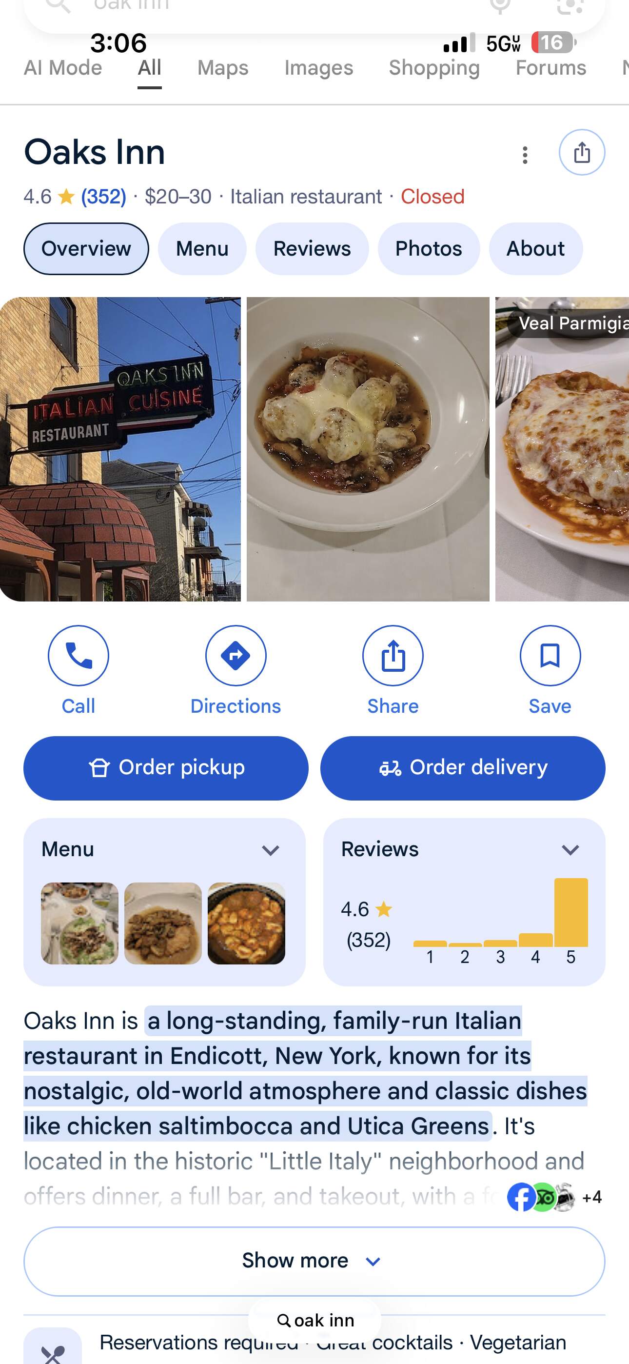 We usually go to one of the red sauce joints for dinner, looking at the oaks inn if I can get a reservation