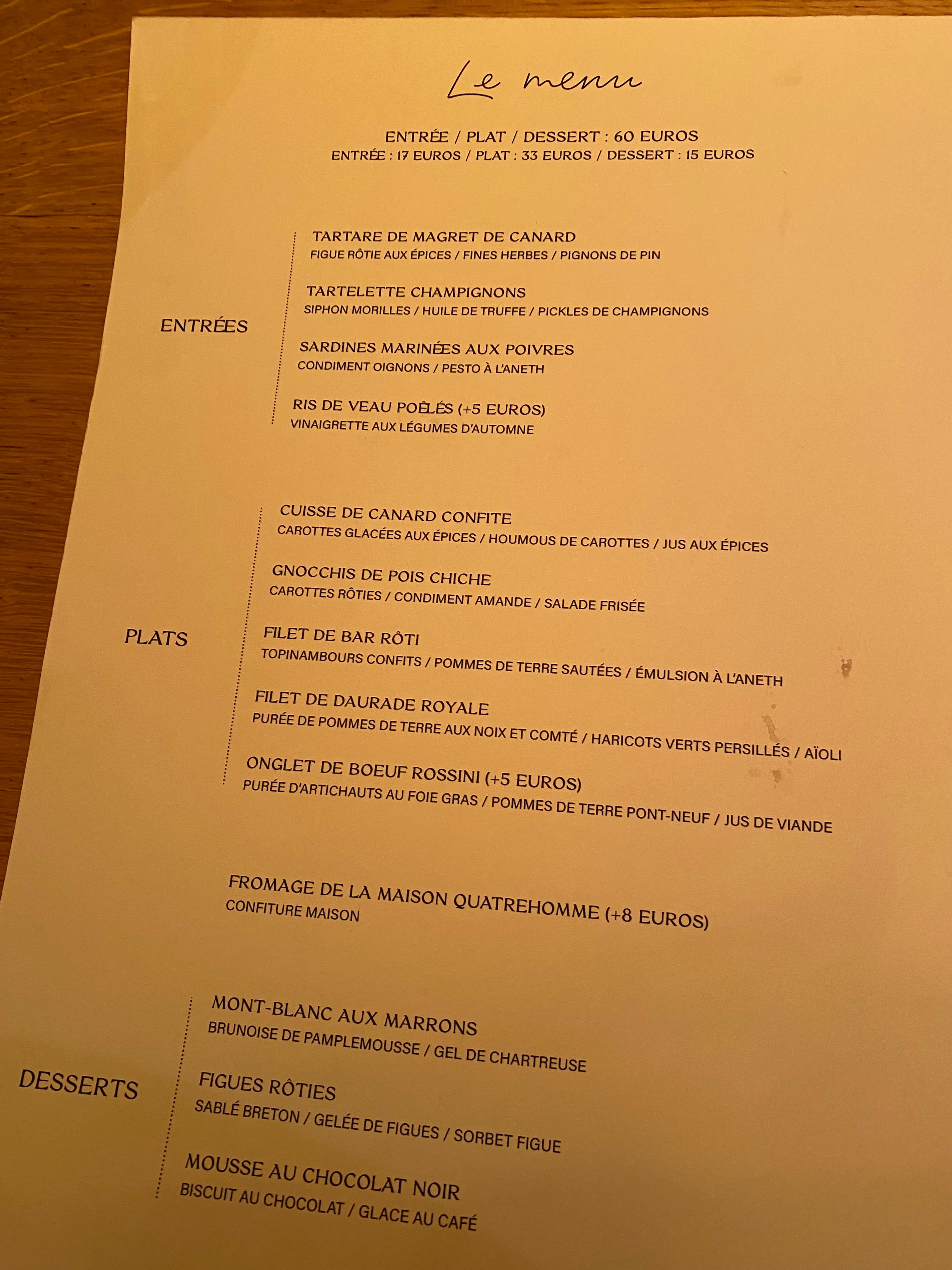 Another thanks to onzieme for writing this up. We had a terrific lunch here yesterday. This is the dinner menu; the lunch menu is 25€ for 2 courses, €30 for 3, with no choice on the plat. We took the 25€ menu and shared a starter & dessert.