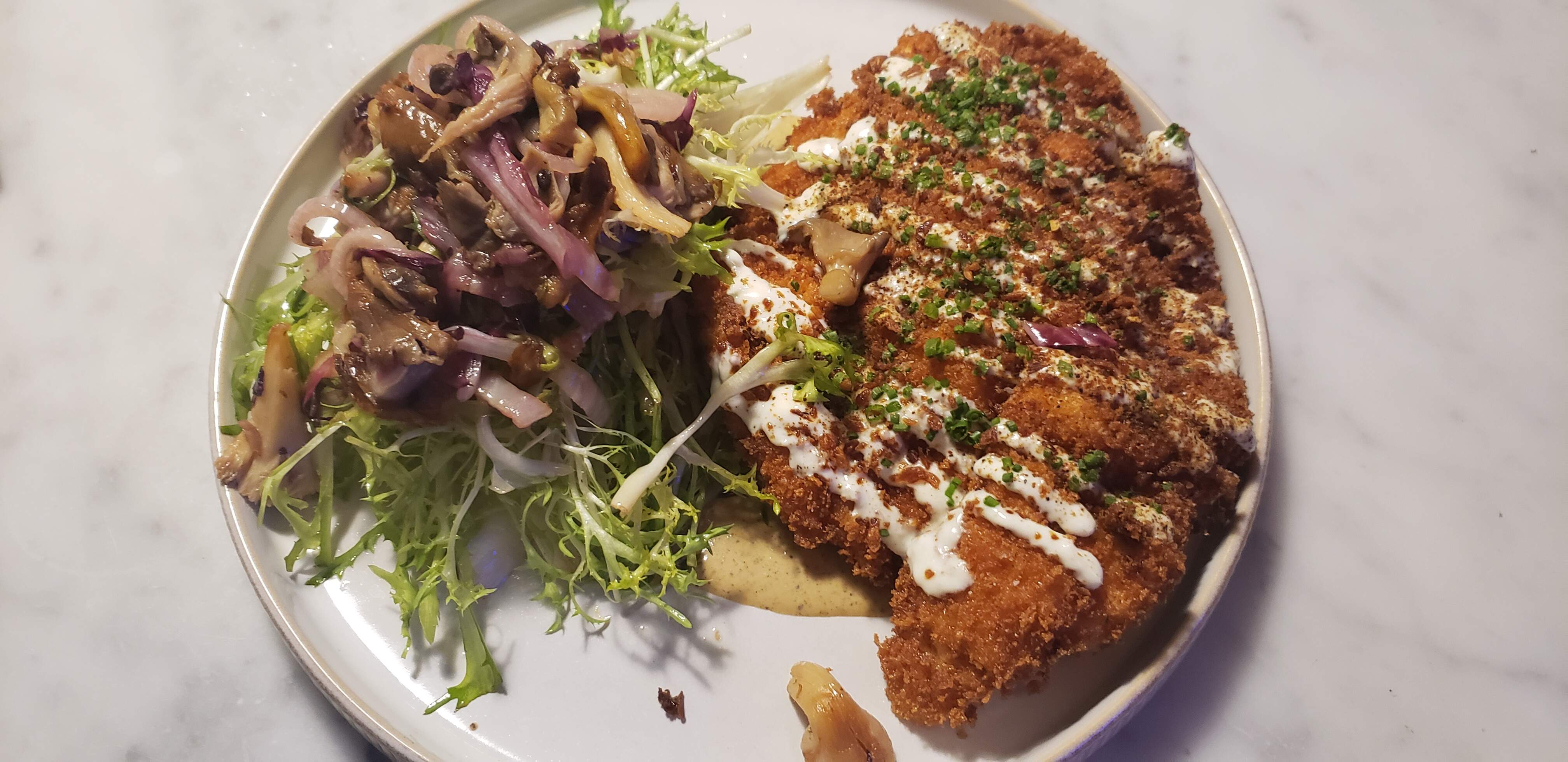 And the others had an enormous Chicken Schnitzel with mushrooms, chicory, sherry, and a pistachio vinaigrette,