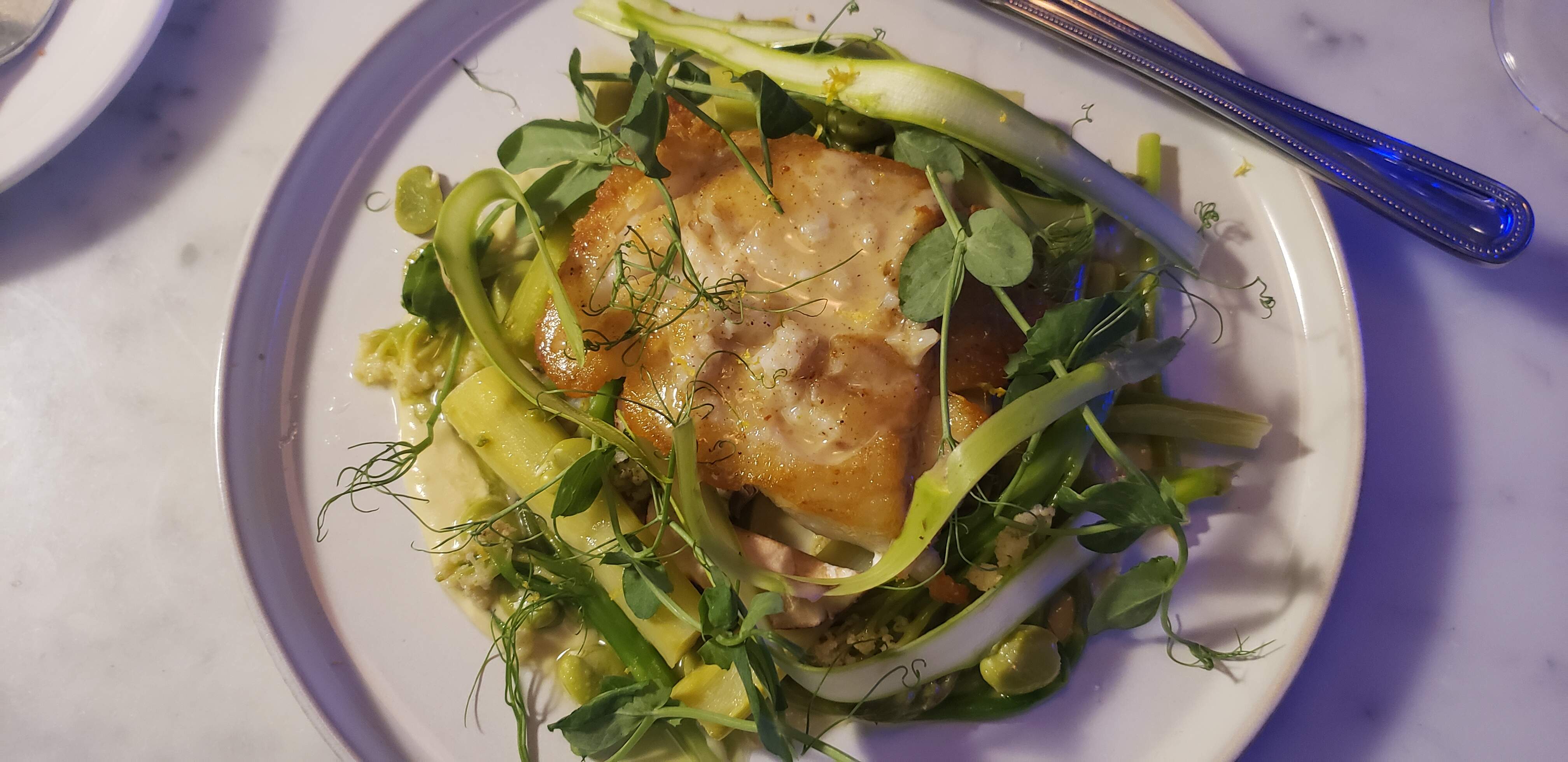 For the main, I had the Hake with leek puree, asparagus, caulilini, fava beans, and a mushroom beurre blanc (could have given me more caulilini and fava beans and left off the asparagus).