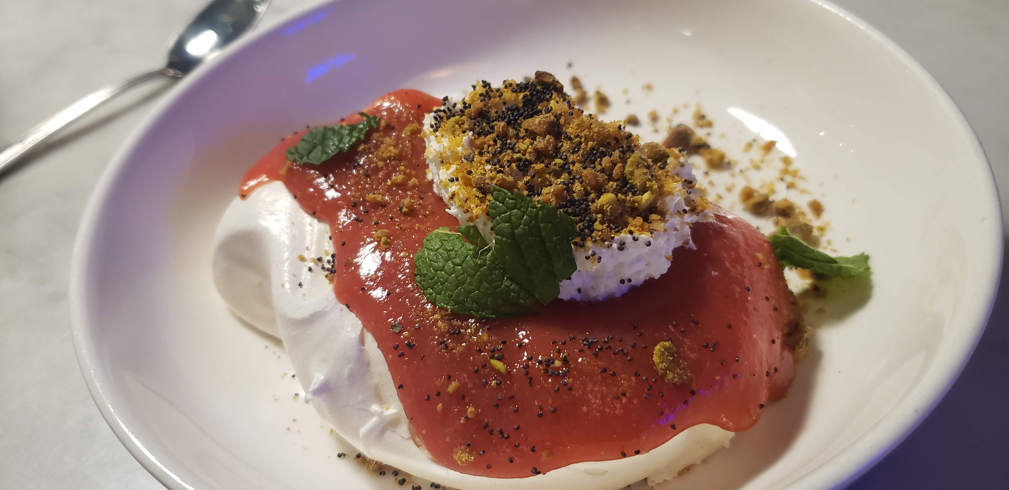 For dessert, one had an Espresso Martini, and we shared the Pavlova with meringue (a bit too hard to break into, but once we did it was very good!), rhubarb curd, pistachio, basil, Chantilly cream, and poppy seeds. Could have sworn it was strawberry, not rhubarb!) (Pistachios seem to be the “It” ingredient this Spring!)