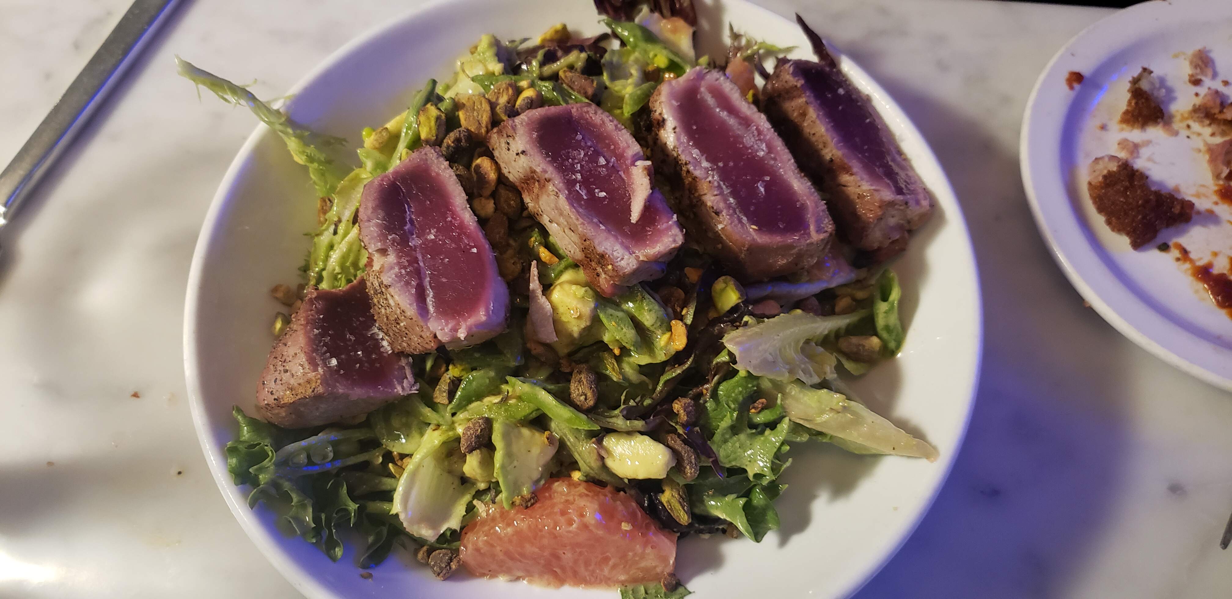 and a Mixed Greens Salad with avocado, grapefruit, snap peas, pistachios and grilled tuna.