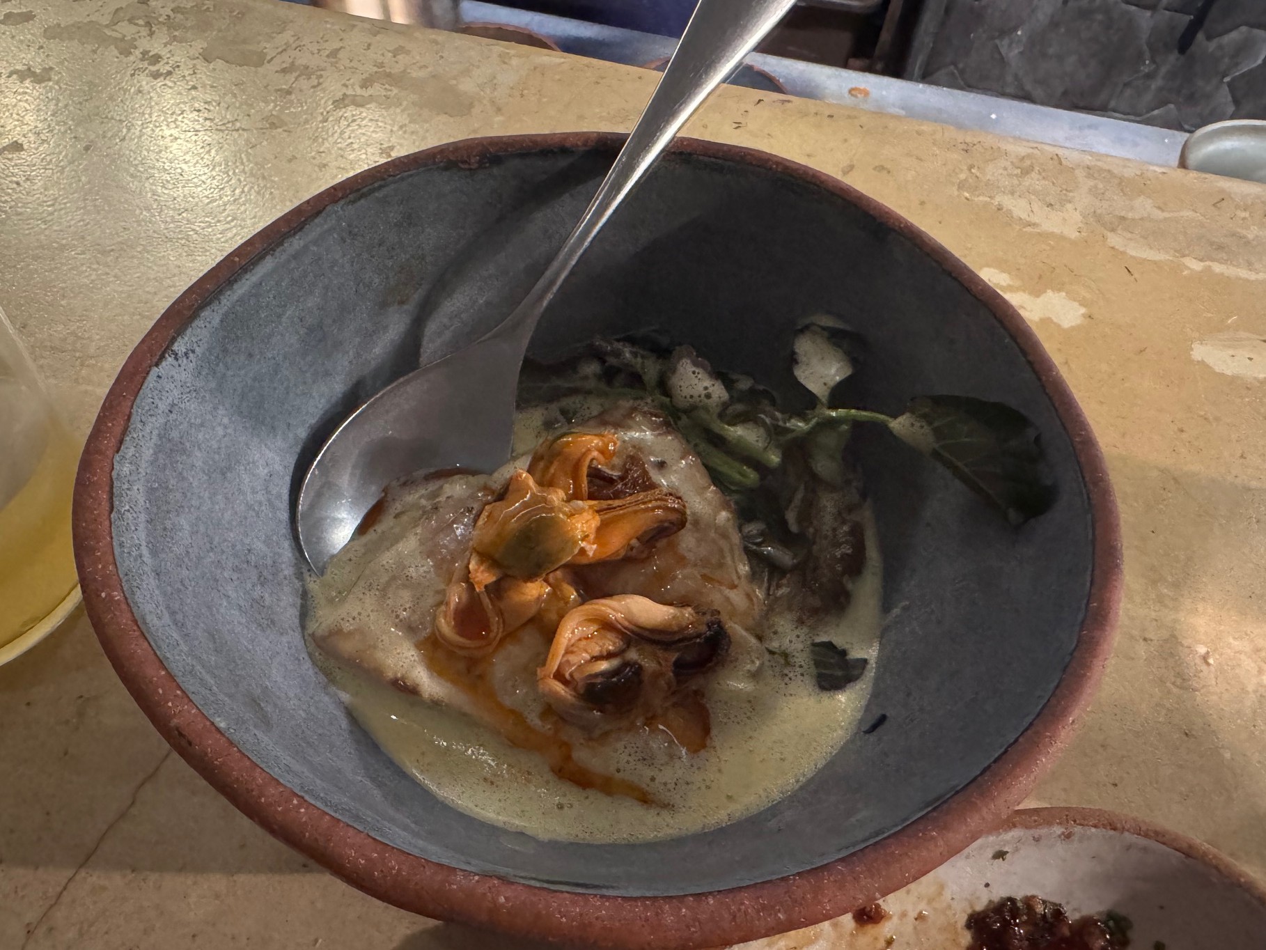 Striped Sea Bass - Another great dish. Perfectly cooked fish. Superb broth with saffron topped with mussels and charred sunchokes. Like the cabbage, not very photogenic