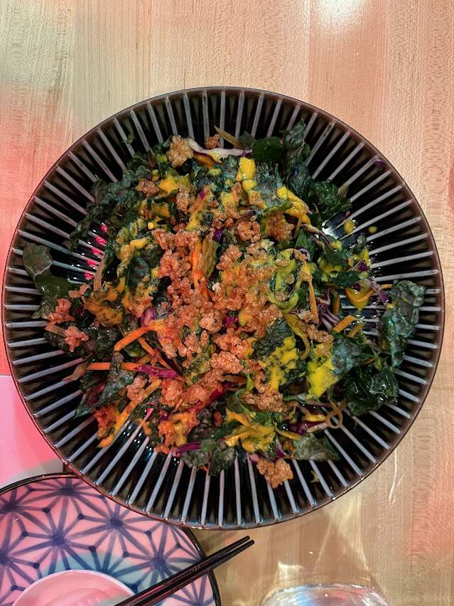 A beautiful kale salad with crispy rice and ginger carrot dressing: