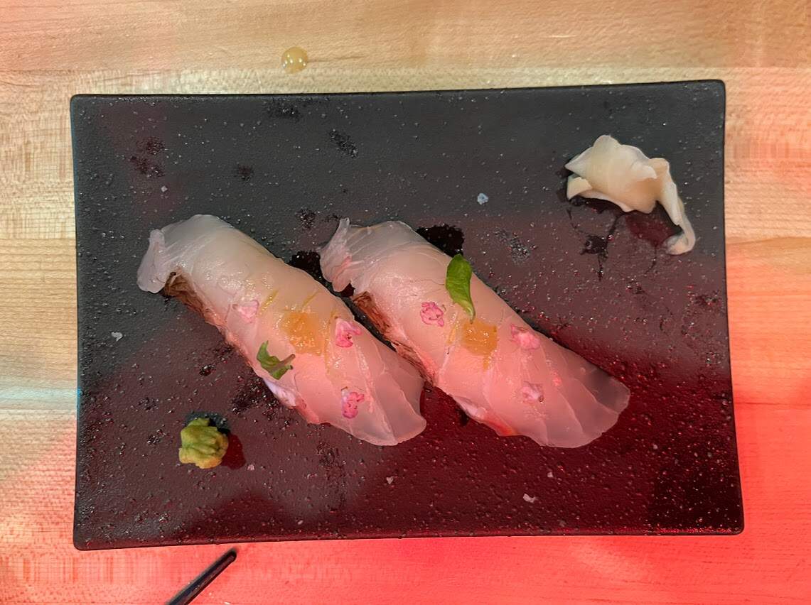 What better food to have with it than another round from Cafe Sushi? I focused on their composed salmon and branzino sushi. On the salmon side I had sesame salmon, lightly torched, melting salmon belly, and 12-spice salmon (in all honesty, I couldn’t identify the 12 spices – rather as one might not be able to identify the individual ingredients in a good garam masala – but the whole was beautifully harmonious). The two branzino offerings were with iced onion and sesame, and – my favorite of the evening – kombu-cured with wasabi oil.