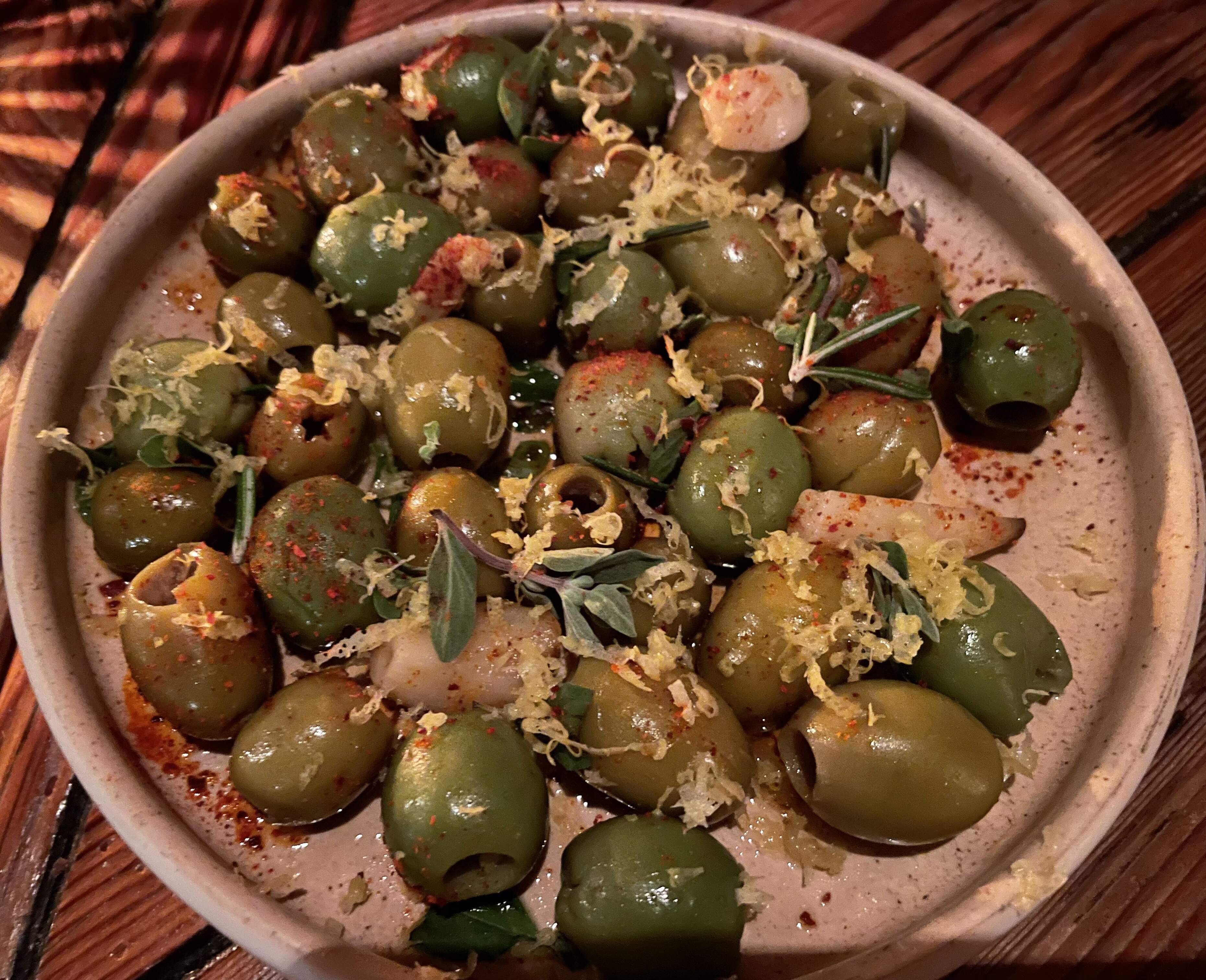 Olives, smoked, citrus marinated, confit garlic, espelette