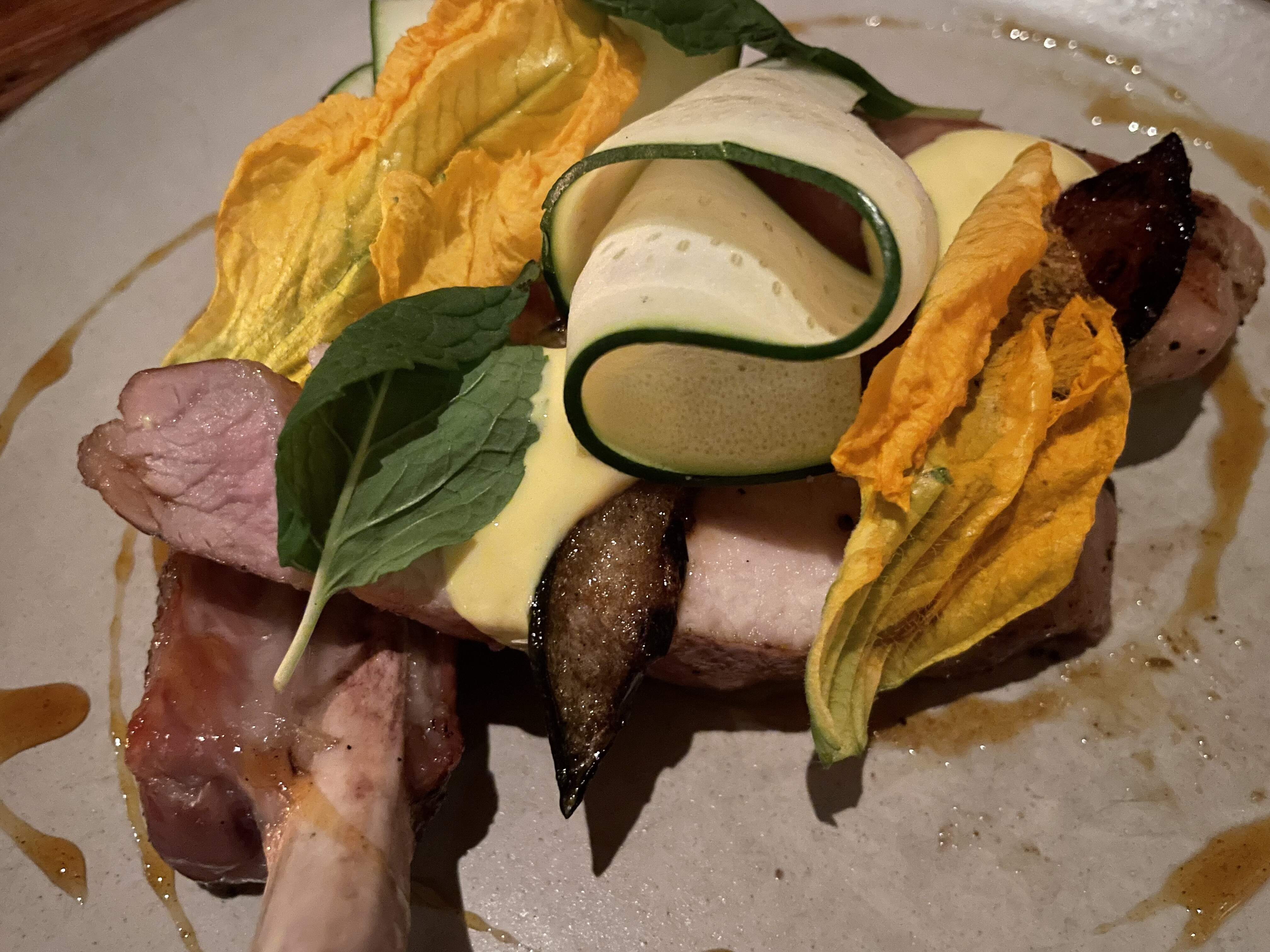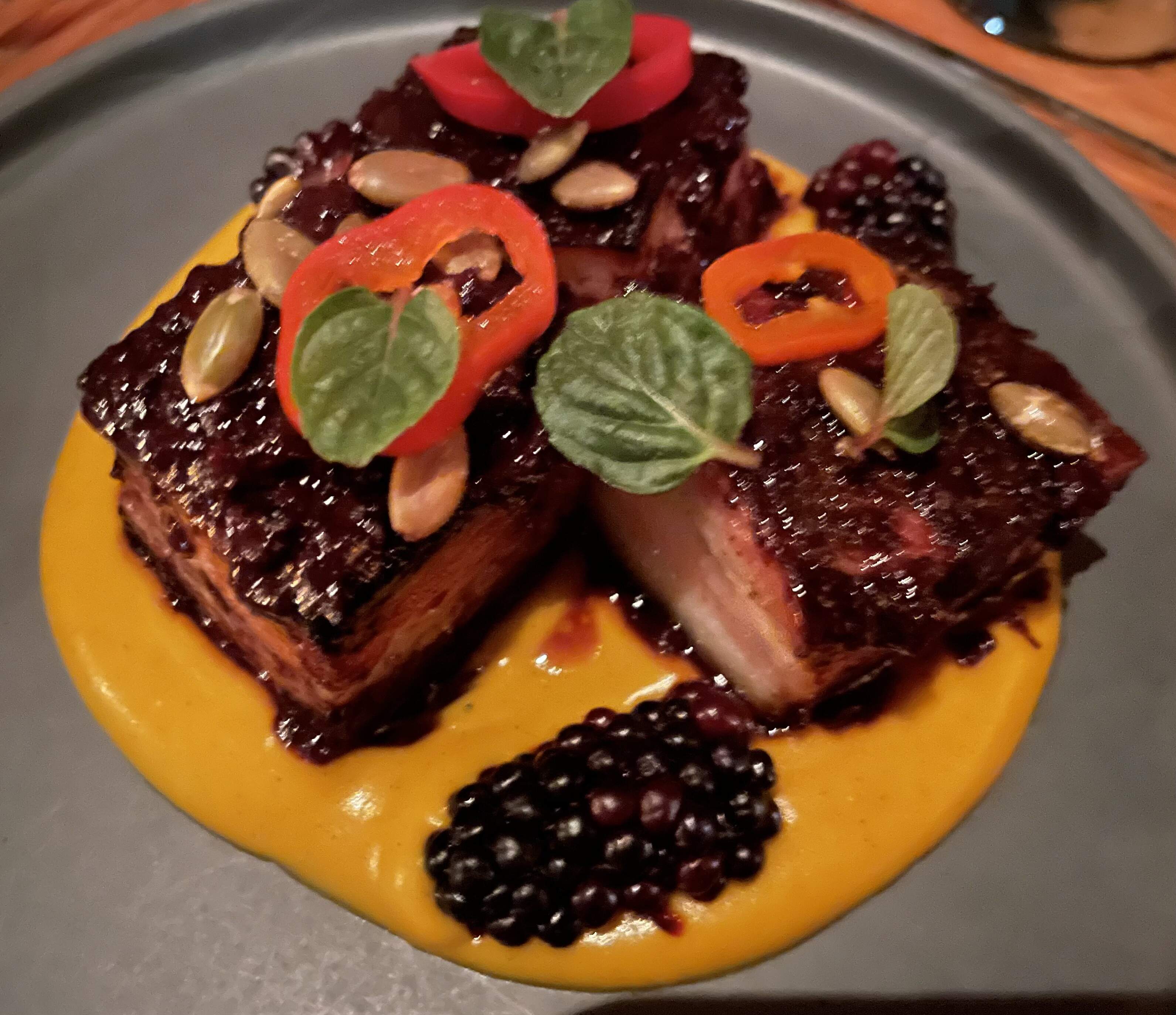 Pork belly, smoked, blackberry, kabocha, mint