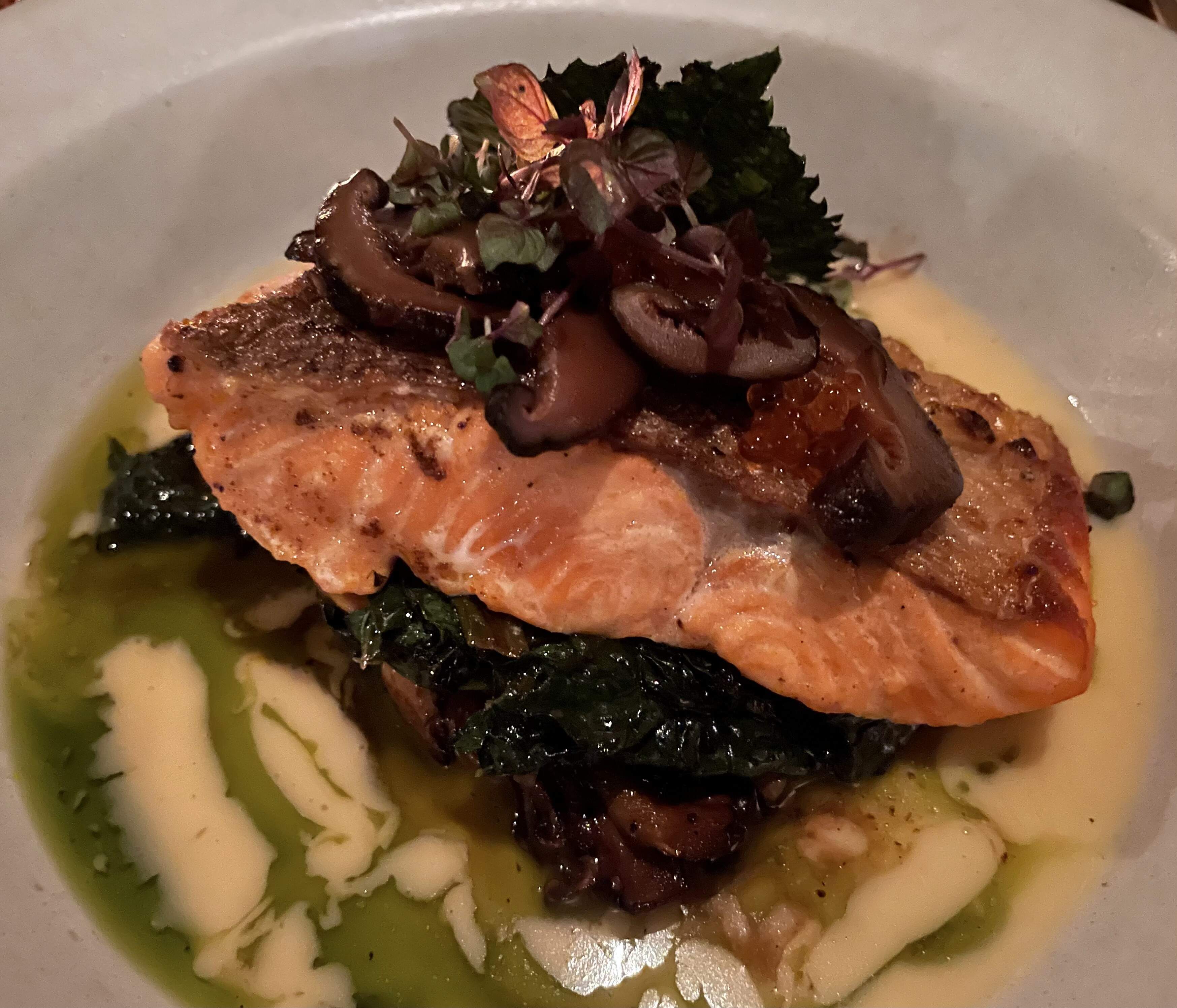 Steelhead trout, grilled, wild mushrooms, miso, black garlic, scallion