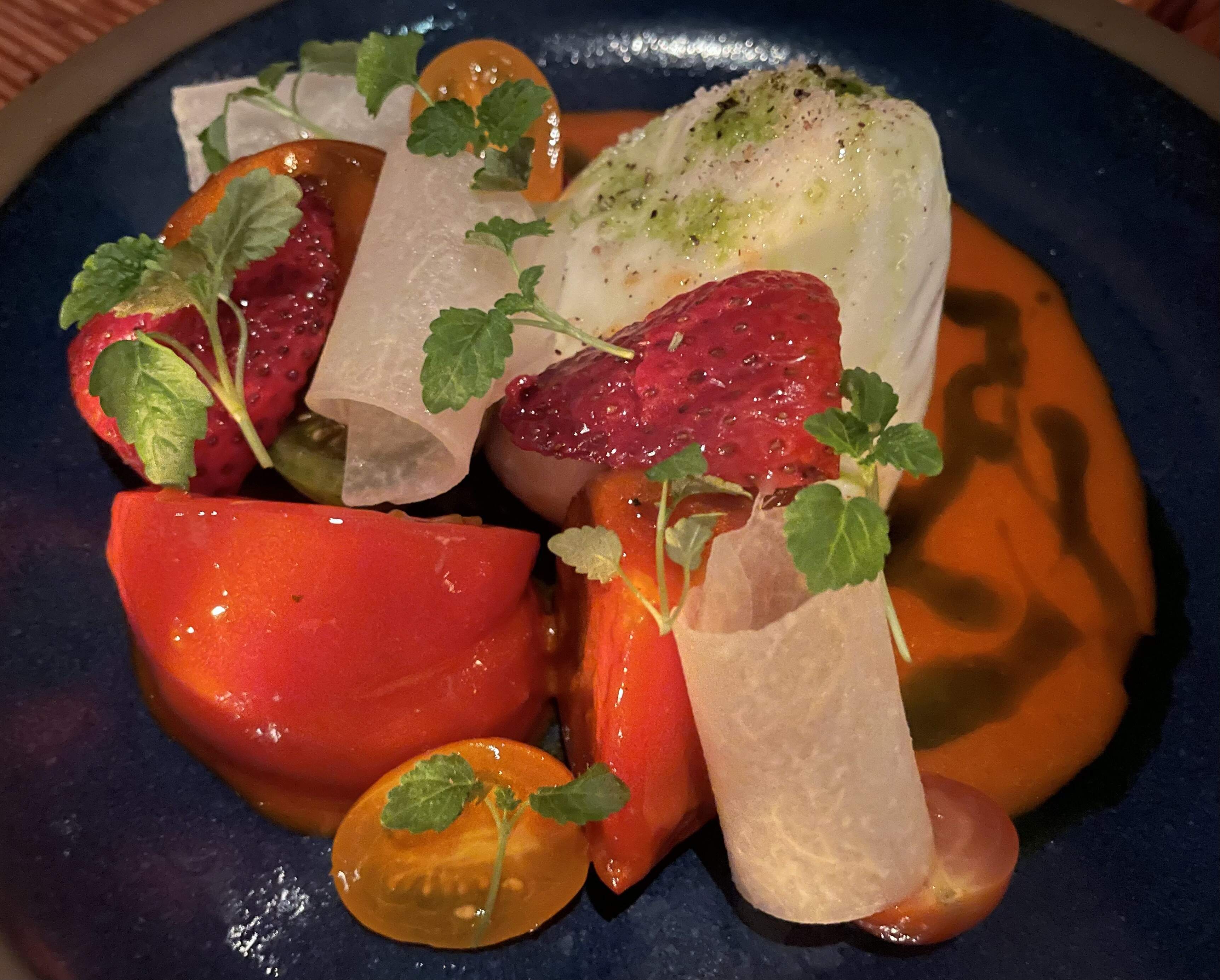 Tomato, burrata, grilled strawberry, jicama, lemon verbana