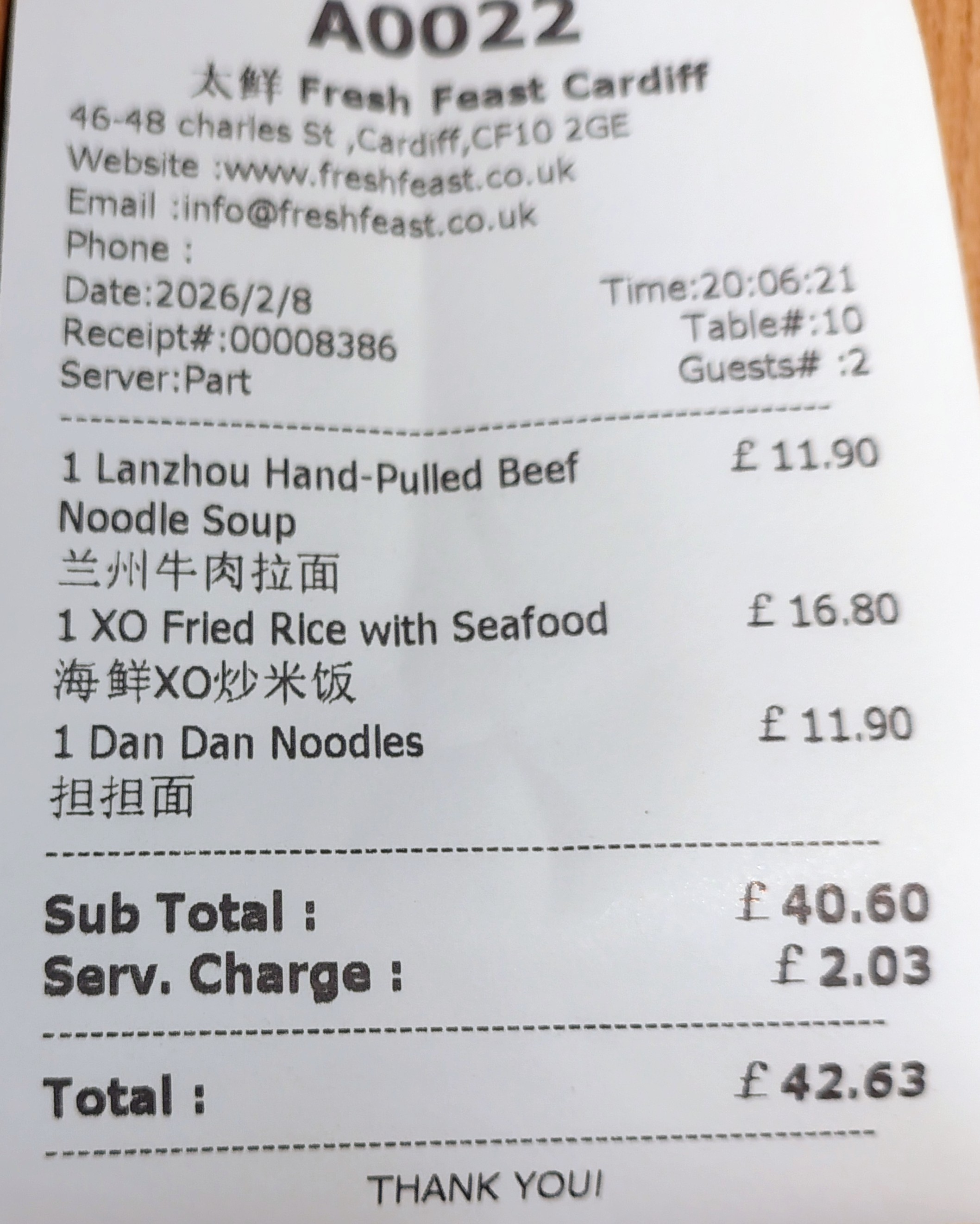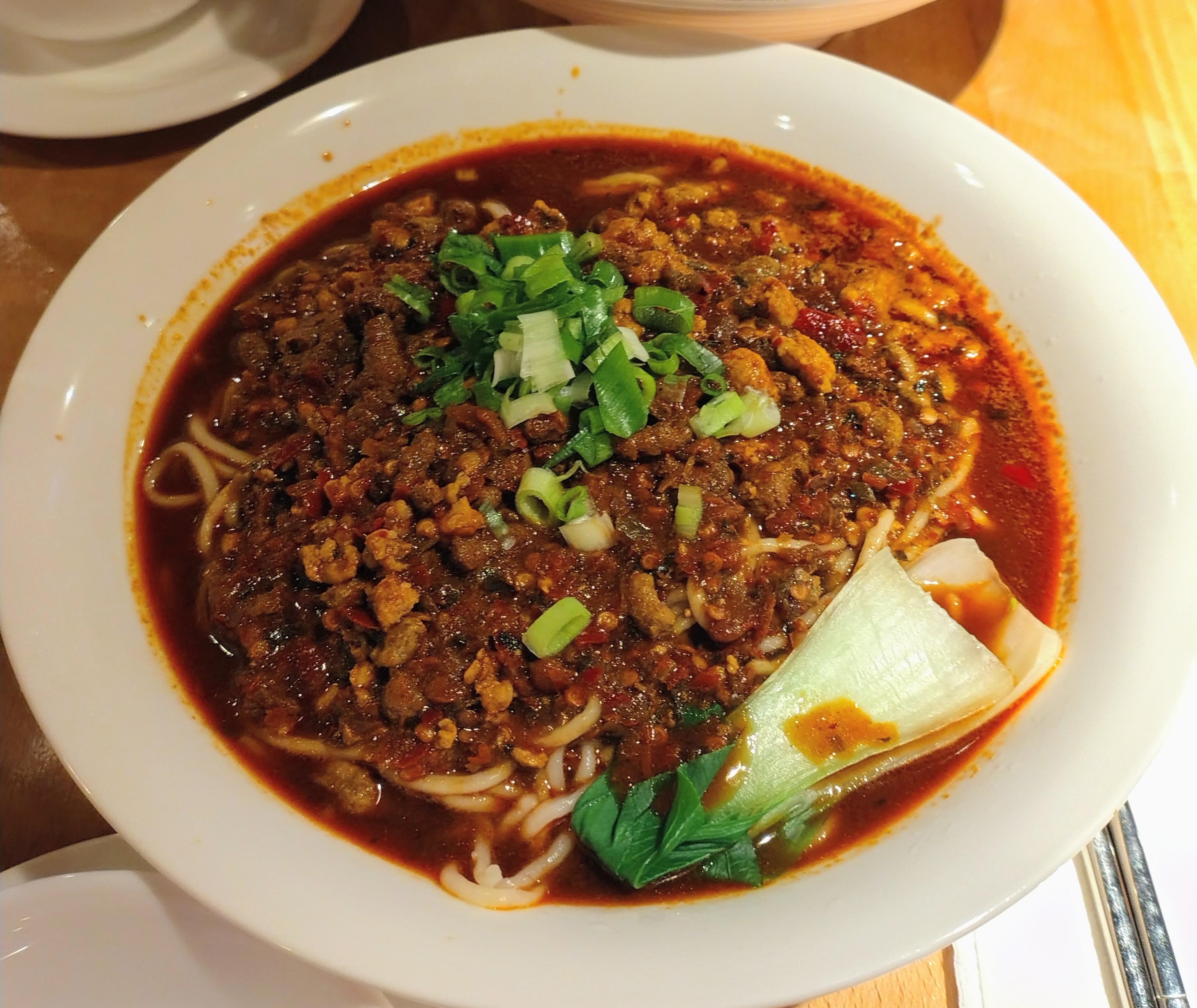 A Chinese restaurant with a wide-ranging menu. We went here on a cold and rainy Sunday evening. It wasn’t very busy and the only other customers were a few Chinese students. Ordering is via iPad. They didn’t have the biang biang noodles I was interested in (they said none of that type of noodles left). So I went for dan dan noodles instead. Son ordered Lanzhou beef noodle soup (with hand pulled noodles). And we got a XP seafood fried rice to share.