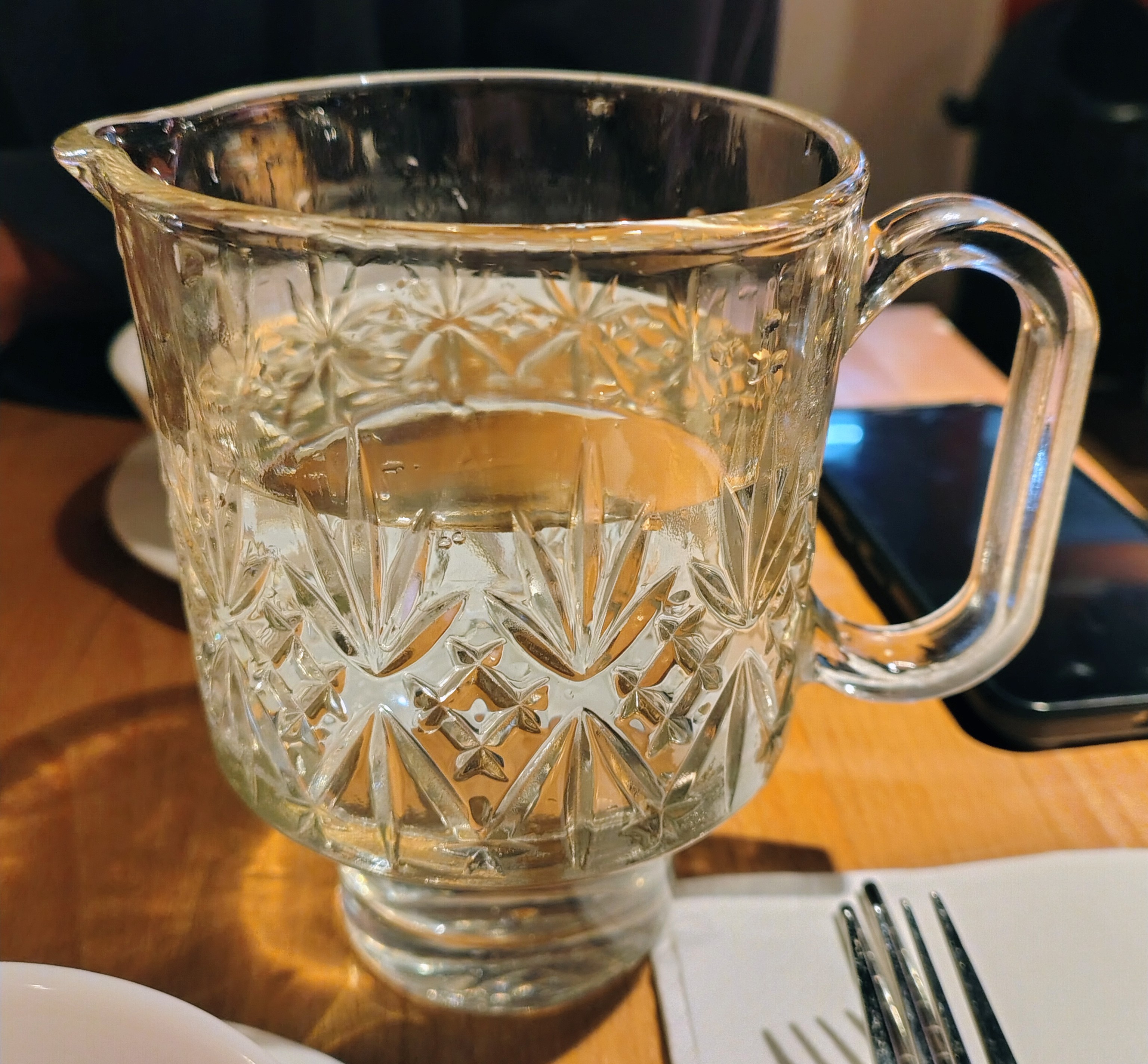 Tap water served in these little jugs to drink directly out of (we were each given a small jug and no other receptacle to drink from)!