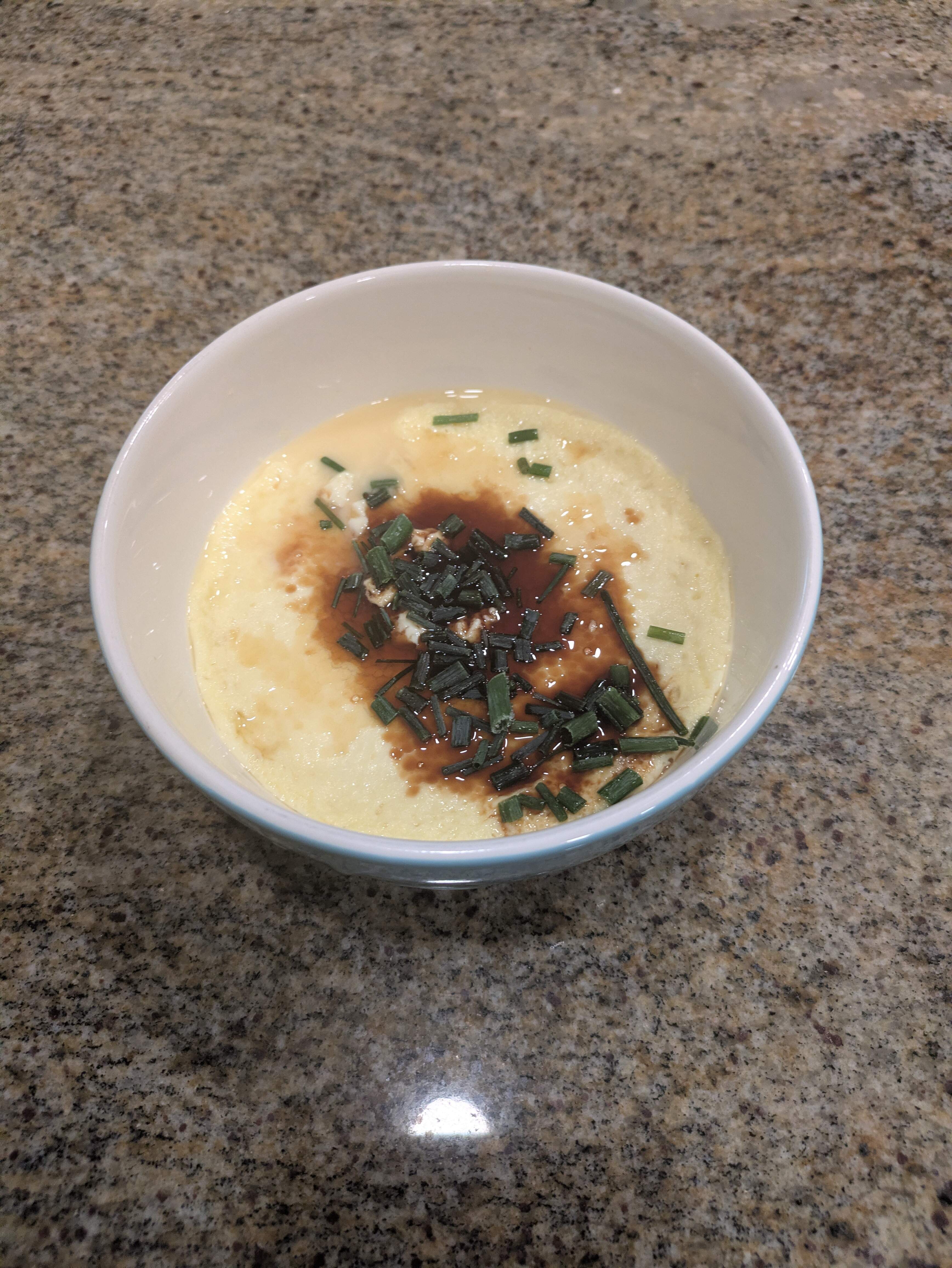 Chawanmushi non Asian style, chicken broth, salt, freshly ground pepper; steamed for 7 minutes over low, gentle steam. Thermometer was 167*, it remained over shut off steam uncovered while I made an espresso. I usually pull my sweet custards at 172*. This was very silky, no bubbles, strained into container through a very fine mesh tea strainer.