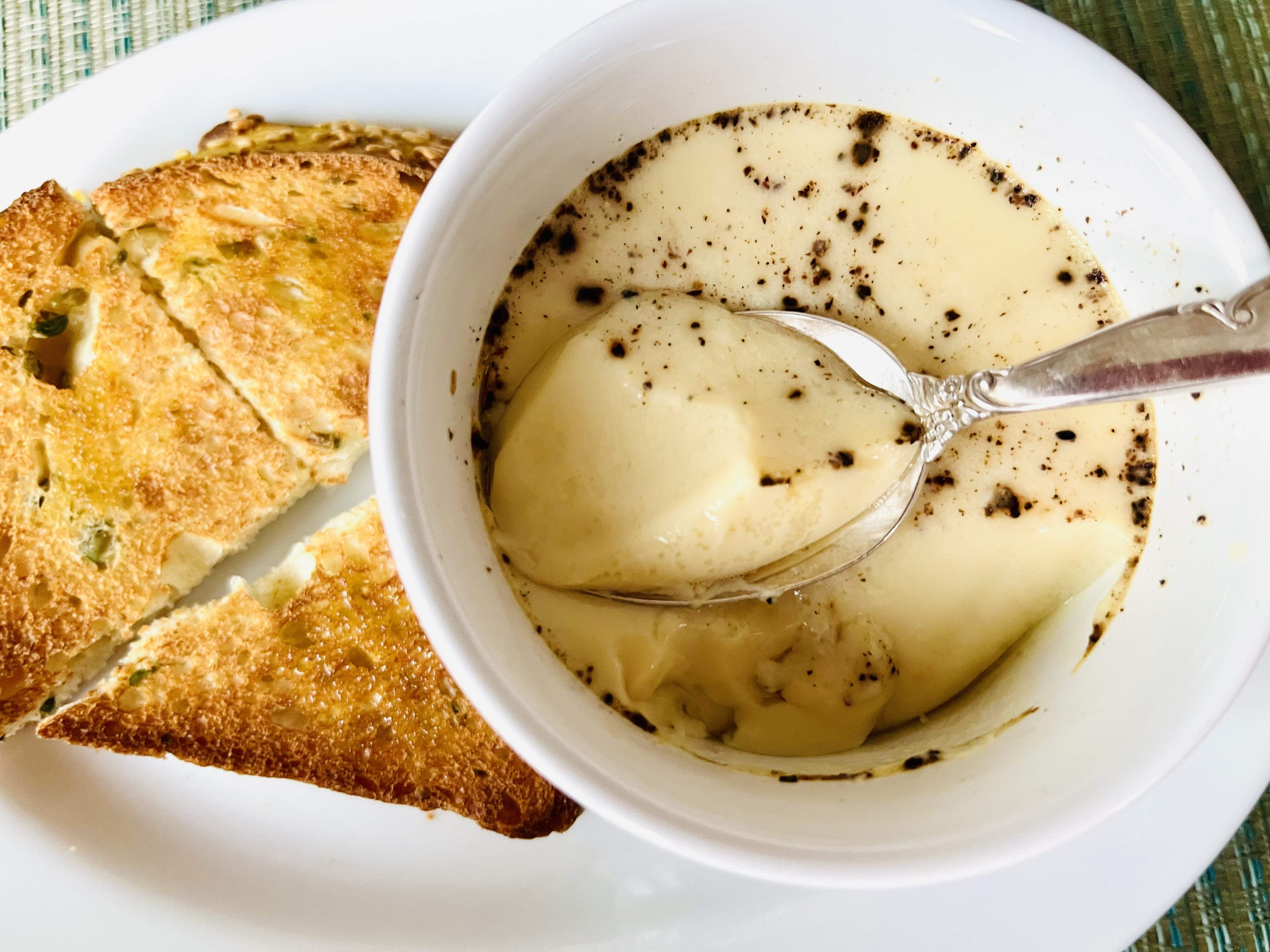 “You’ll know you’ve succeeded when your spoon slinks down into the custard; the tiniest amount of broth will exude, an indication that the mixture just nearly missed its breaking point.”