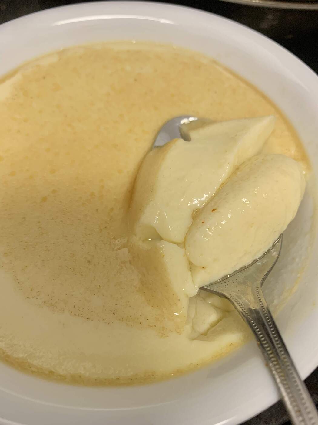 @shrinkrap There shouldn’t be separated liquid, just like quiche or scrambled eggs (for chinese egg custard and chawanmushi that is – korean custard / gyeran jjim is cooked at a higher temp and I’ve never seen it not separated at a restaurant – puffy bubbly eggs on top, liquid underneath, not quite my jam).