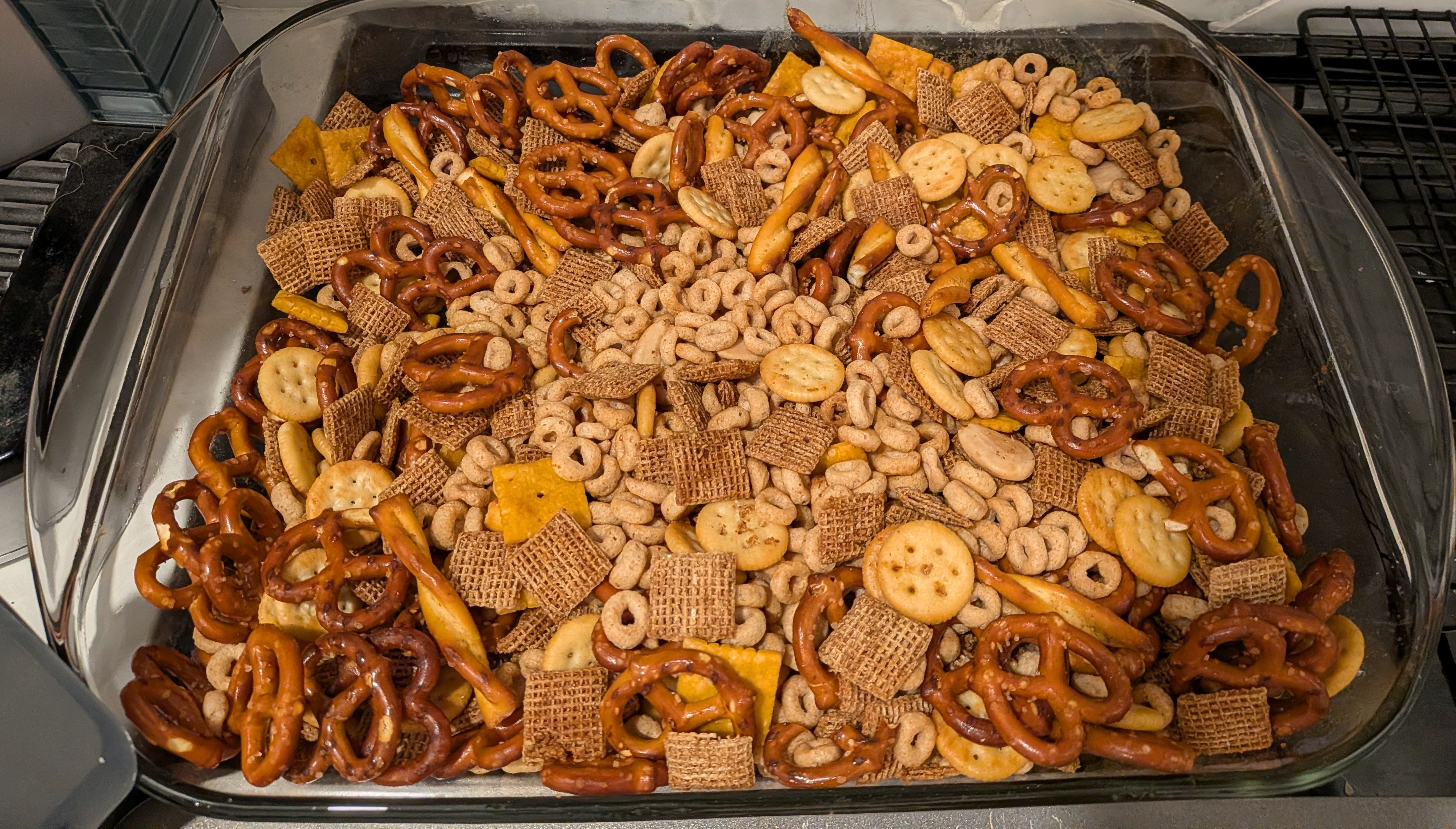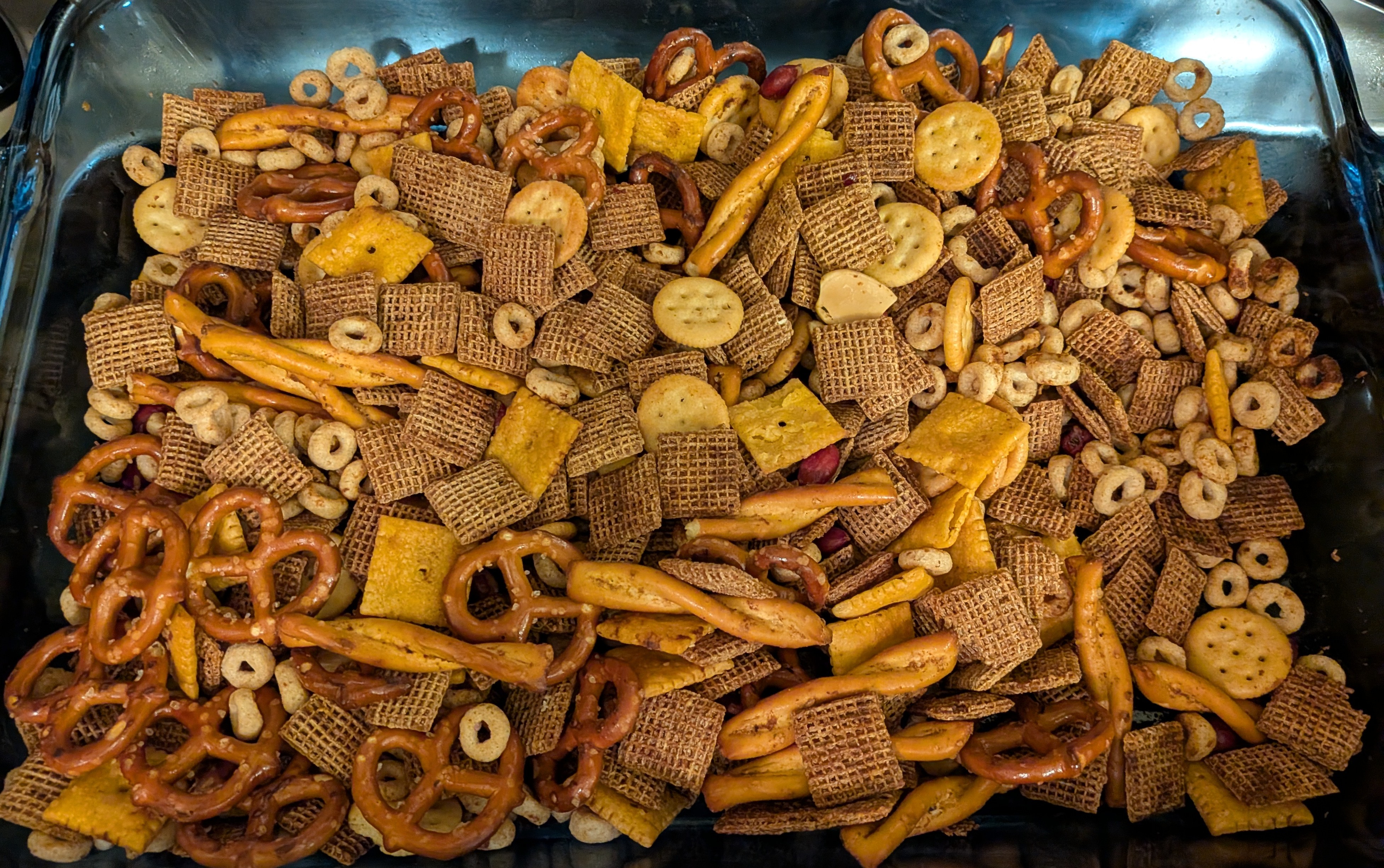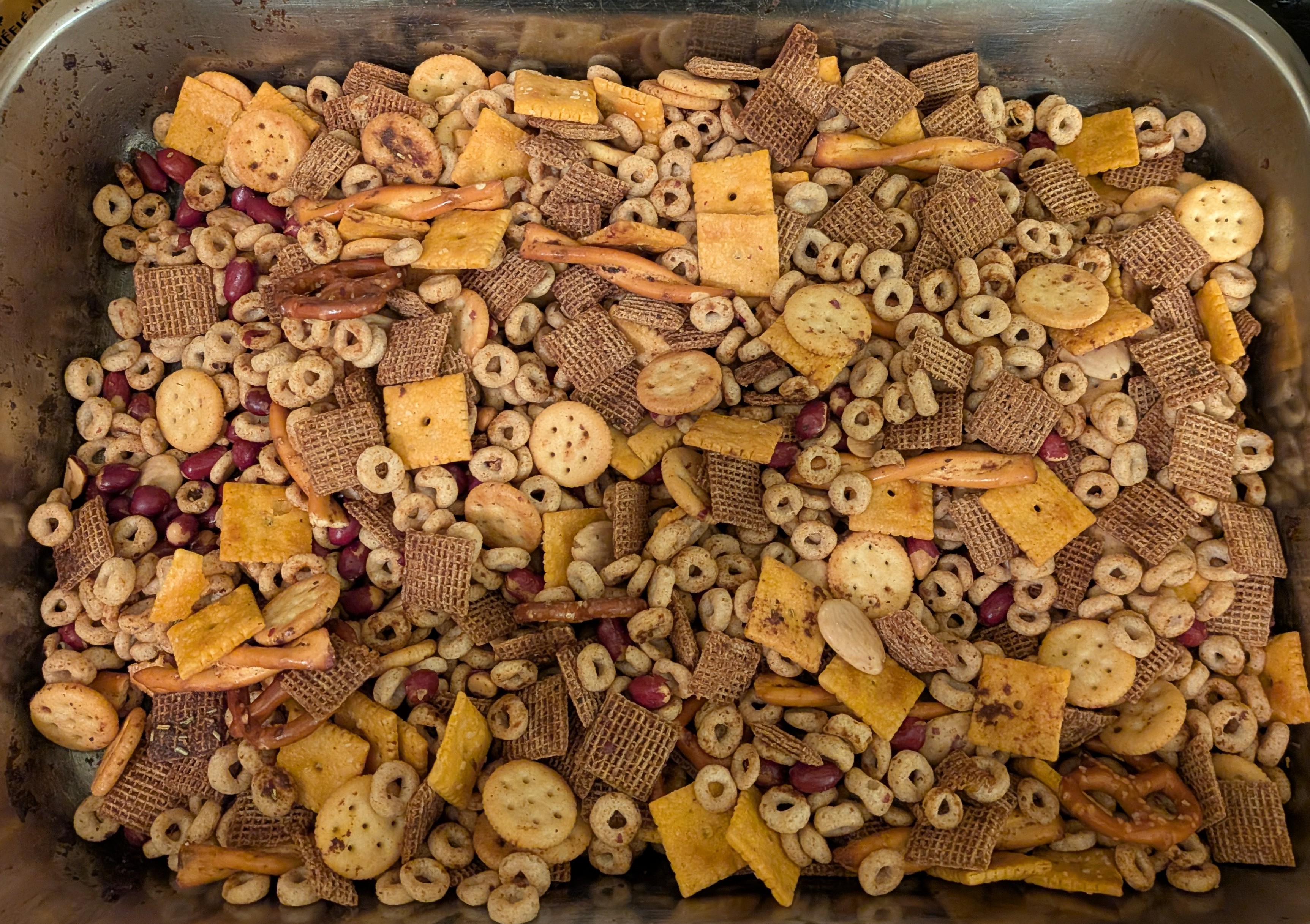 I am making a party mix with Rice Chex, Cheerios, Cheese Bits, mixed nuts, and using butter, tamari, various peppers, and French Fry seasoning. Will post results in an hour!