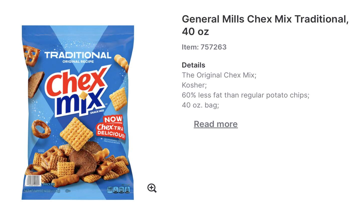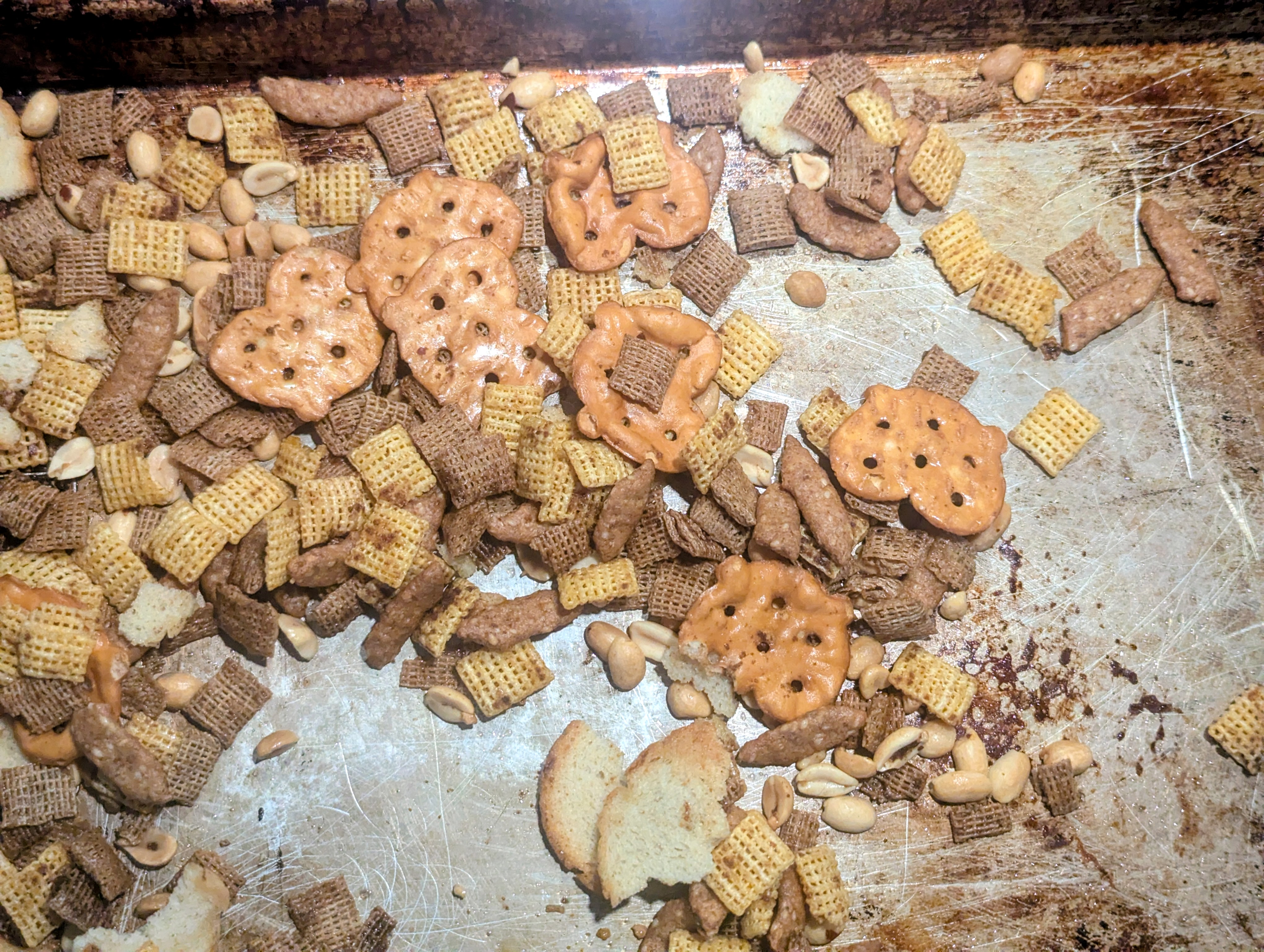 Today I made a batch with wheat and corn Chex, TJ’s pretzel slims and sesame sticks, unsalted peanuts, and bagel chips. I used reduced-sodium Lowry’s and a little extra Worcestershire, and subbed olive oil for butter. Turned out well.