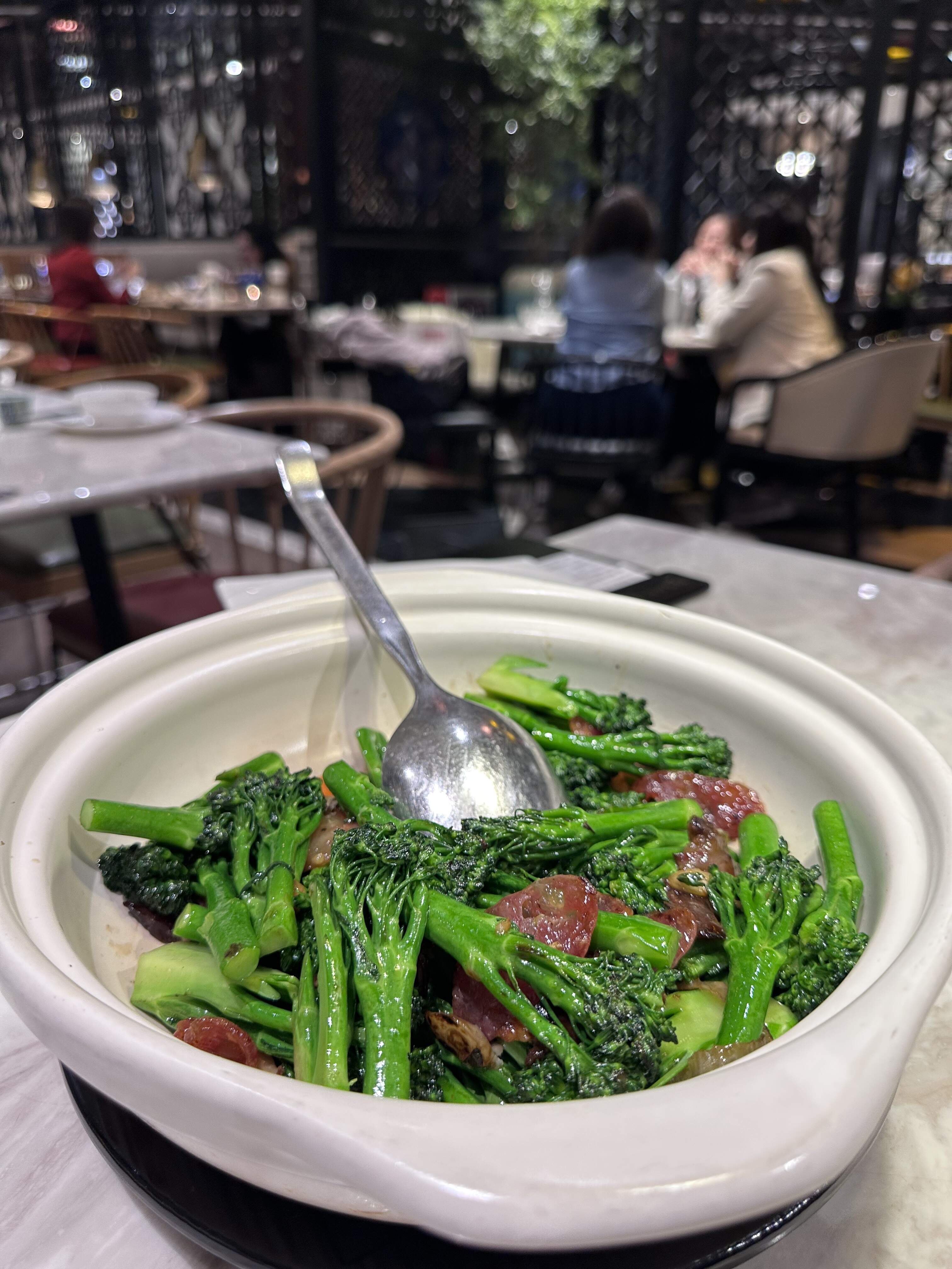 A huge pot of Lap Cheung and Lap Yuk. Nicely done, crispy and well seasoned. (Broccolini?)