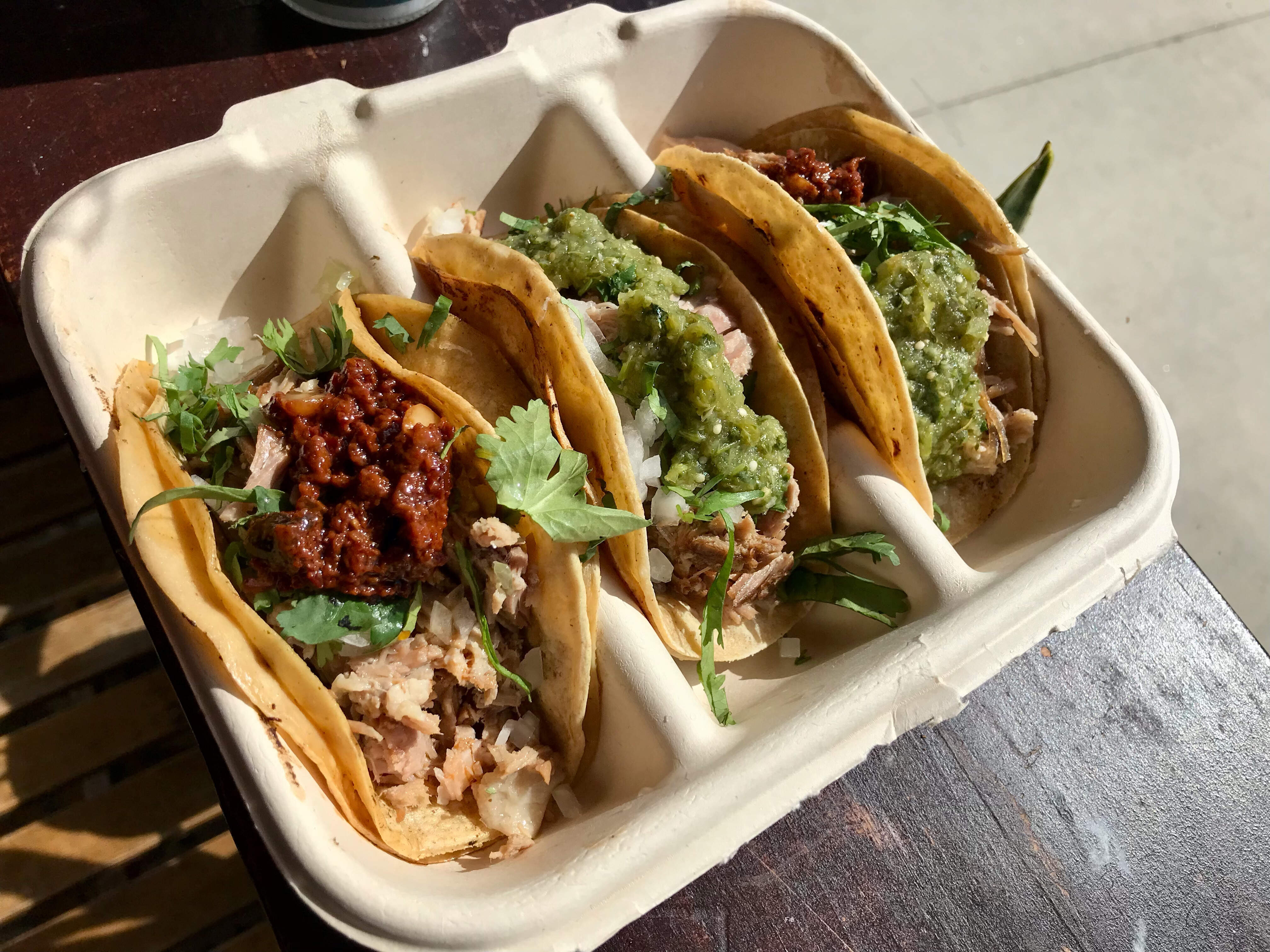 This place though. Beautiful tacos, soft corn shells (two of them) wrapped around slow cooked meats. Top it yourself at an outstanding little bar of amazing salsas and other toppings. I know that sounds strange but trust the process. These homemade salsas are so good. They’re the star of the place.