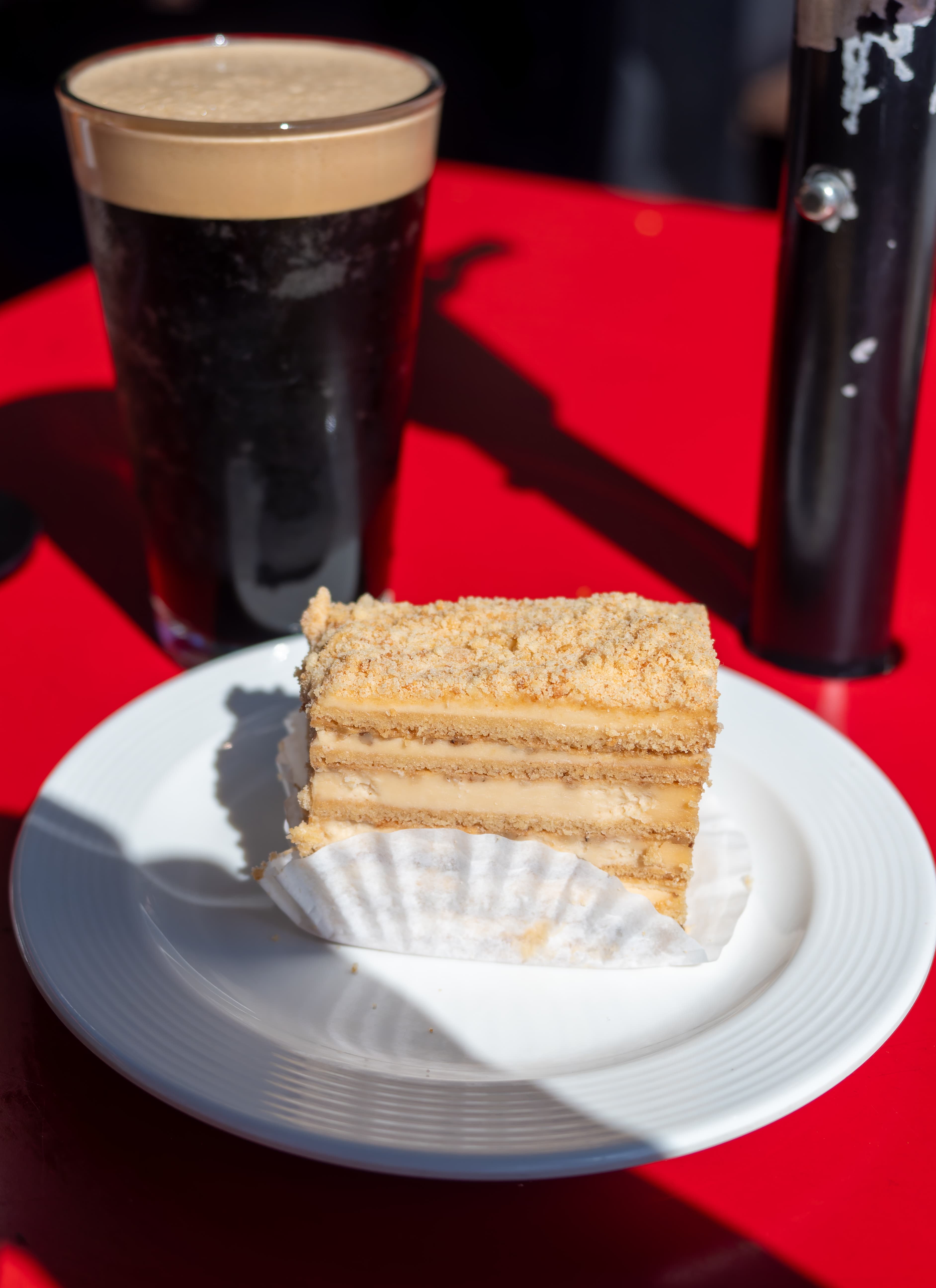 And I also had a slice of honey cake, along with a pint of North Coast Old Rasputin Russian Imperial Stout which they have on nitro. The honey cake was a very nice dessert, with many interleaved layers of honey flavored cake and frosting with a crumbly topping. It was moist and not overly sweet.