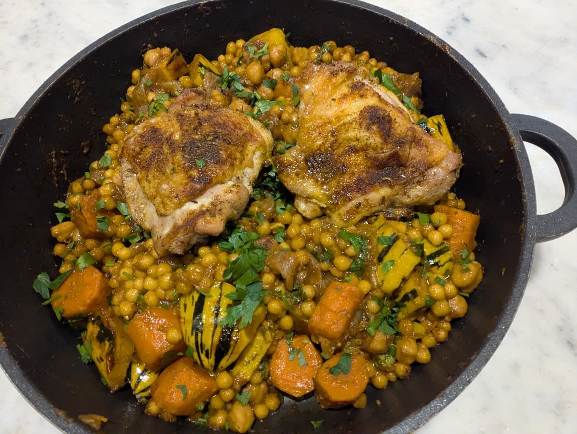 On the stove, cook sliced onions and salt in hot oil (10in 5in sauce pan) 5 min, add tomato paste and sugar then cut up carrots and squash (I used sweet potatoes) then a couple of cans of chickpeas, drained, spice mix 8 garlic cloves, and chicken stock, simmer about 15 min covered until veg are tender, then take out vegetables, strain and keep warm. Measure stock and return specified 2.5 C or so to pan, add 250 g of maftoul or fregola. Here I got into trouble because I bought mograbieh thinking it was the same as maftoul at a syrian store. No its not, its a bigger pasta ball, and has different grain content apparently so it took longer than maftoul would have taken to cook (recipe says 10 min) and needed more fluid. ANYWAY it did finally finish cooking, we fluffed the stuff up, added the veg and some chopped parsley and lemon juice, topped it with the chicken and served. Another triumph, I am still enjoying the pasta and chickpea stew, its exotic flavor is just fascinating and wonderful. Could have cooked more chicken this makes more than 4 servings - maybe the recipe meant the full leg and thigh.
