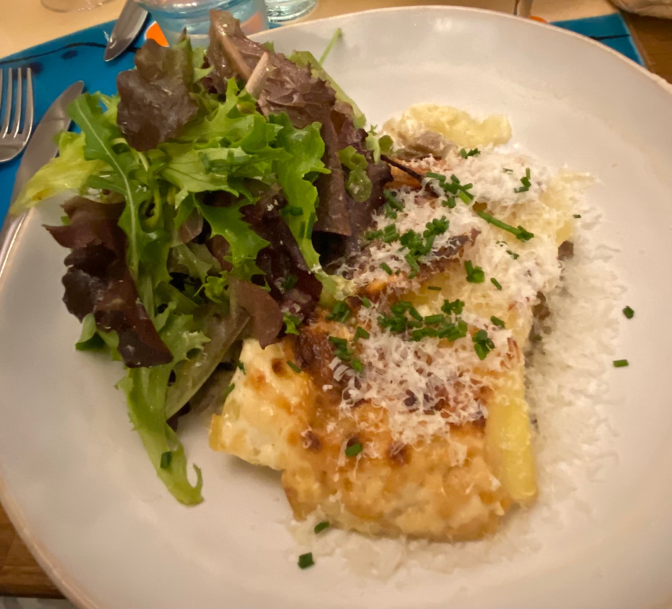 I never had gratin dauphinois as a main before, so I was curious about what we would get. I was thrilled to see the salad, which had a touch of sesame oil. The gratin was popping hot, and so warming. Talk about sticking to ribs. But I tried to remind myself it was a vegetarian lunch, so it couldn’t be all bad. ![]()