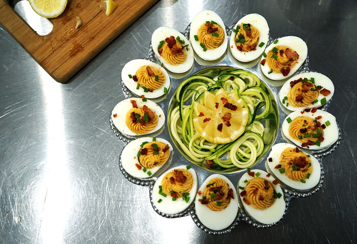 mayo, maple mustard, green pickle relish, black pepper, rosé vinegar, chopped dill pickle and green onion deviled eggs