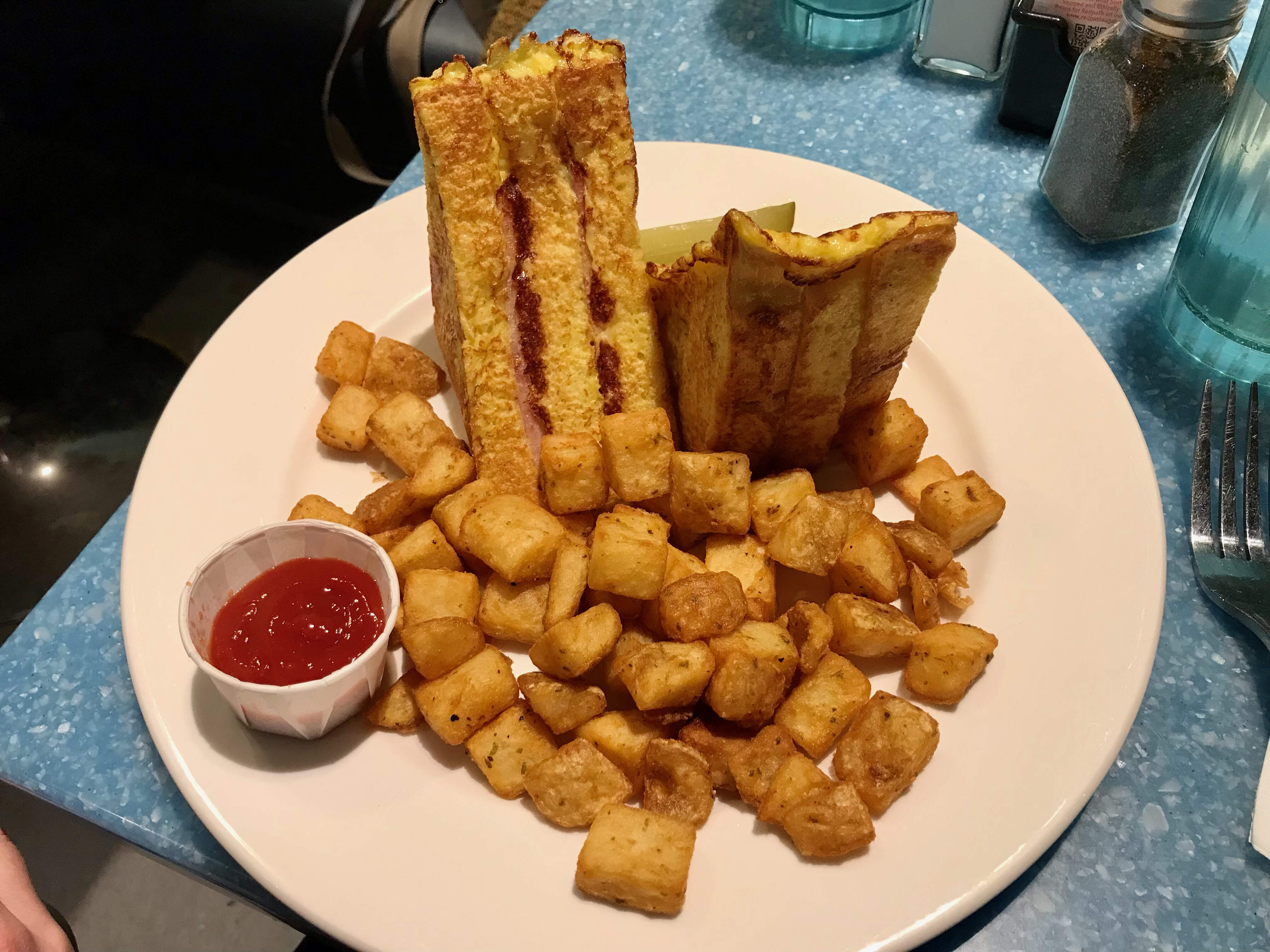 Best was the Monte Cristo: ham, turkey, and Swiss cheese between 3 slices of thick Texas toast, dipped in egg, and then grilled, served with crispy home fries. Delicious, the truck stop version of a croque monsieur.