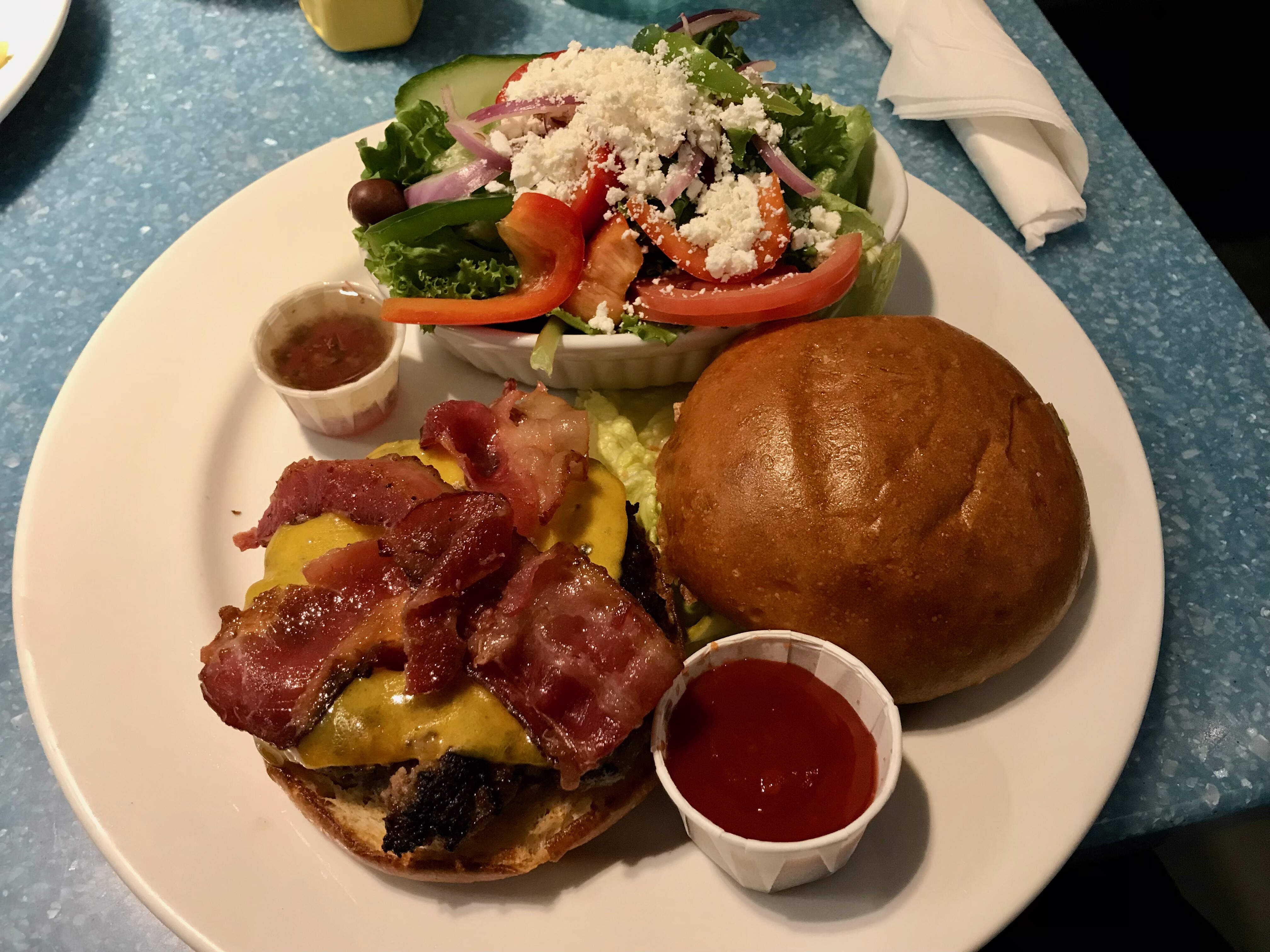 Better was the Legendary Banquet Burger. I had no idea that Fran’s was the official originator of the bacon cheeseburger. The half-pound burger patty was firm and juicy and topped with melted Canadian cheddar and bacon. It also came with pickle slices, anemic tomato slices, and crispy lettuce. We subbed in a side Greek salad over the fries.