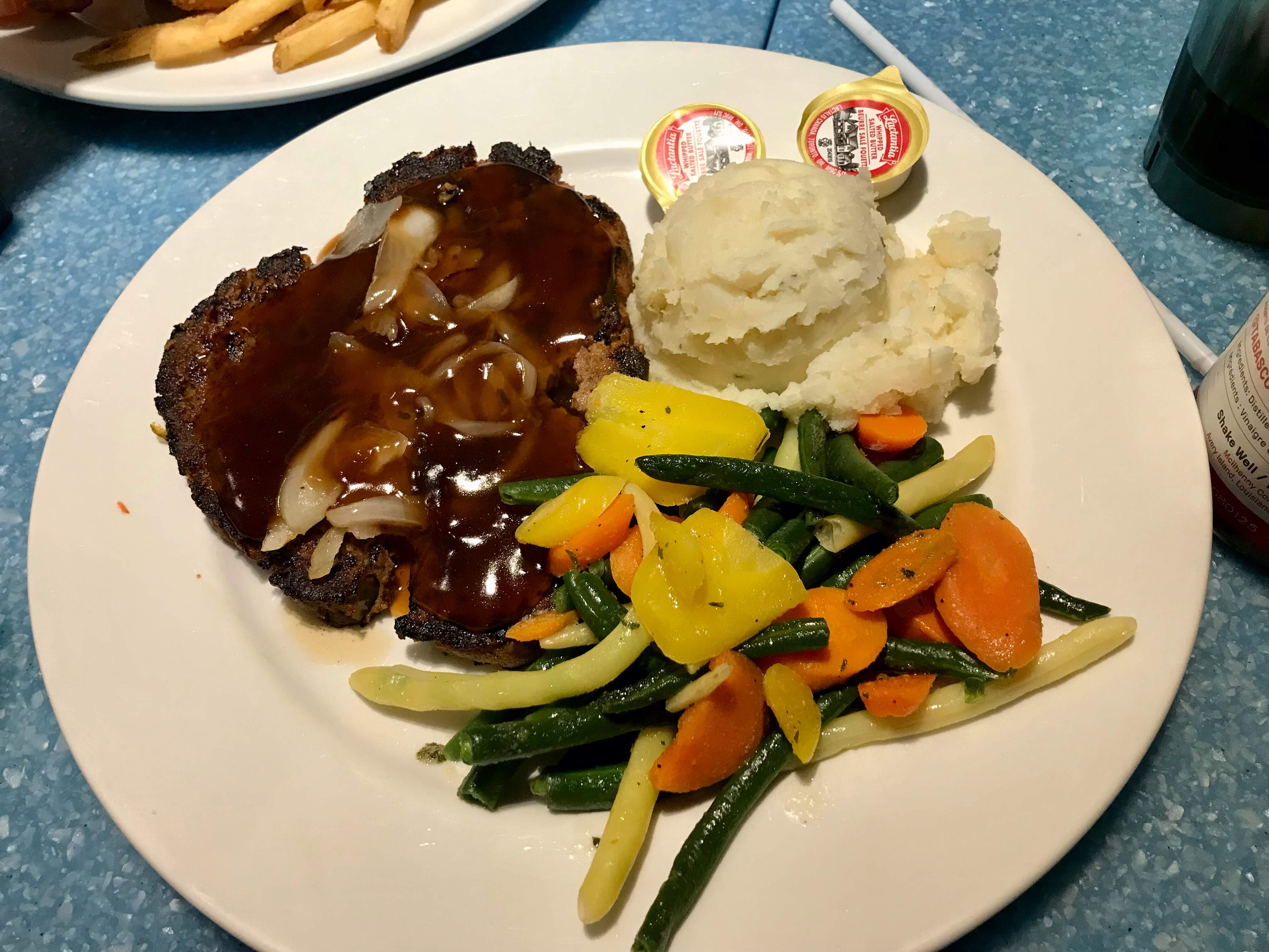 We tried a couple of classics. Fran’s Meatloaf was tasty enough, with caramelized onions and topped with a bland beef gravy. It was served with mashed potatoes and veggies.