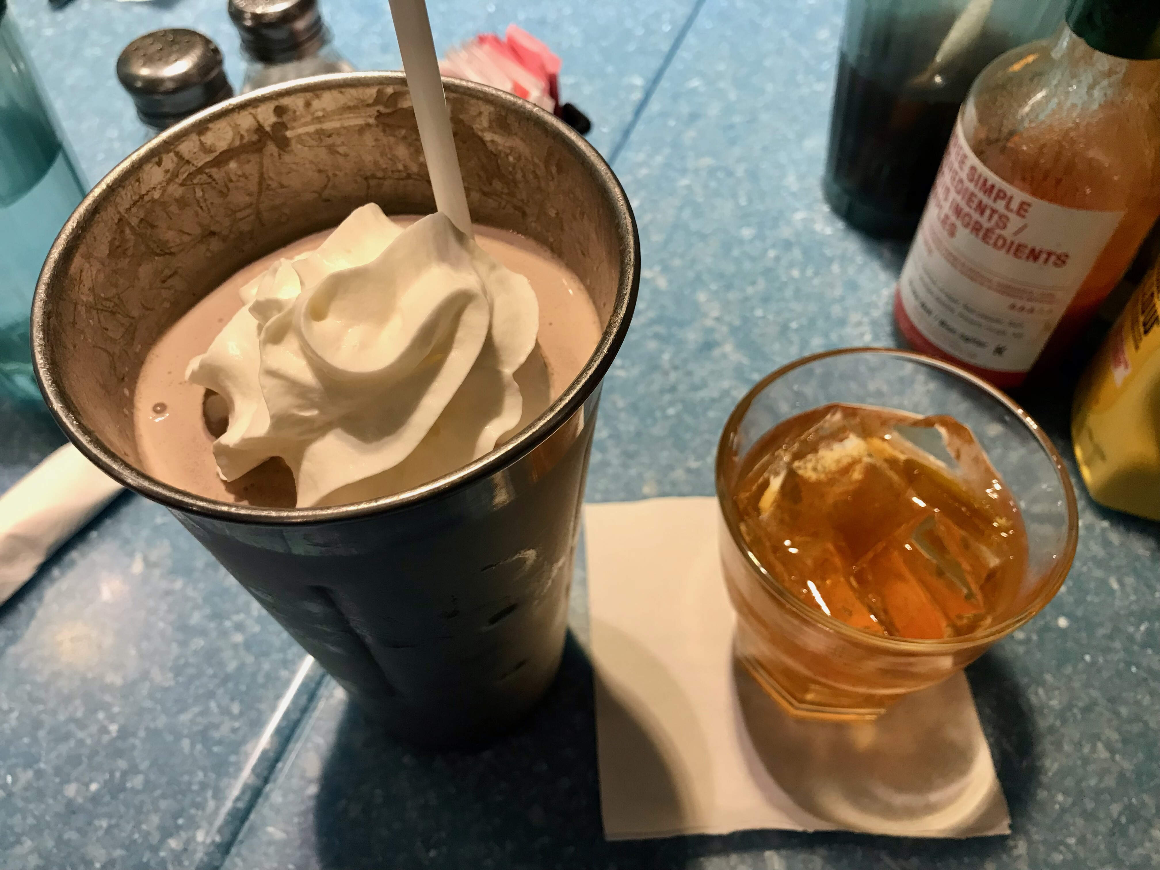 I tried the Fran’s Old Fashioned: John Sleeman & Sons Traditional Kentucky Style Whiskey, maple syrup, Angostura bitters, orange peel. Simple and strong. My wife had the chocolate milkshake, topped with whipped cream. She loved it.