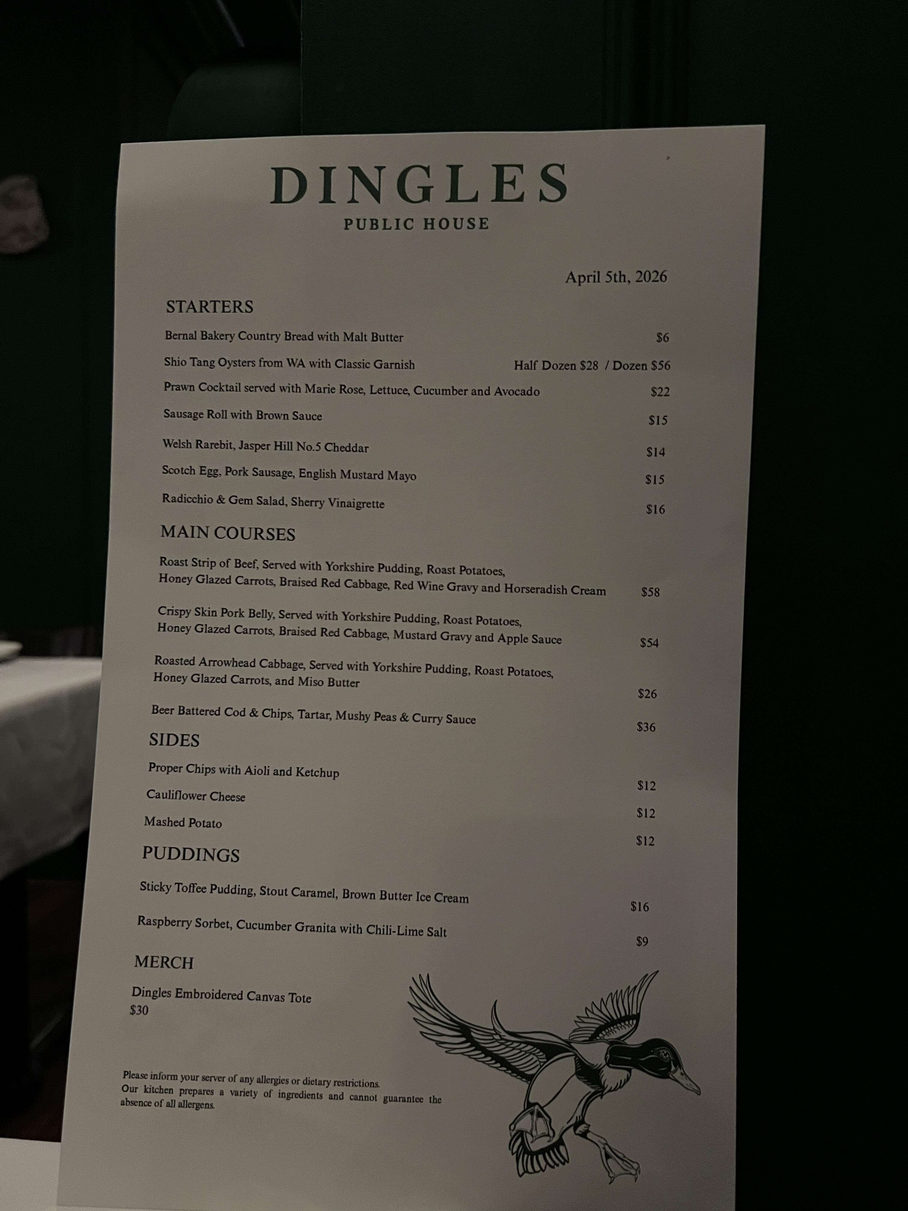 On Sunday, I had an early dinner at Dingles Public House, a new British-style pub from sommelier Anissa Dingle and chef George Dingle that opened last November. It’s in the Club Wyndham Inn at the Opera hotel in Hayes Valley in a space which once housed the Scandinavian restaurant Pläj. There aren’t too many upscale British-style pubs in SF. I can only think of The Cavalier in SoMa as another example.