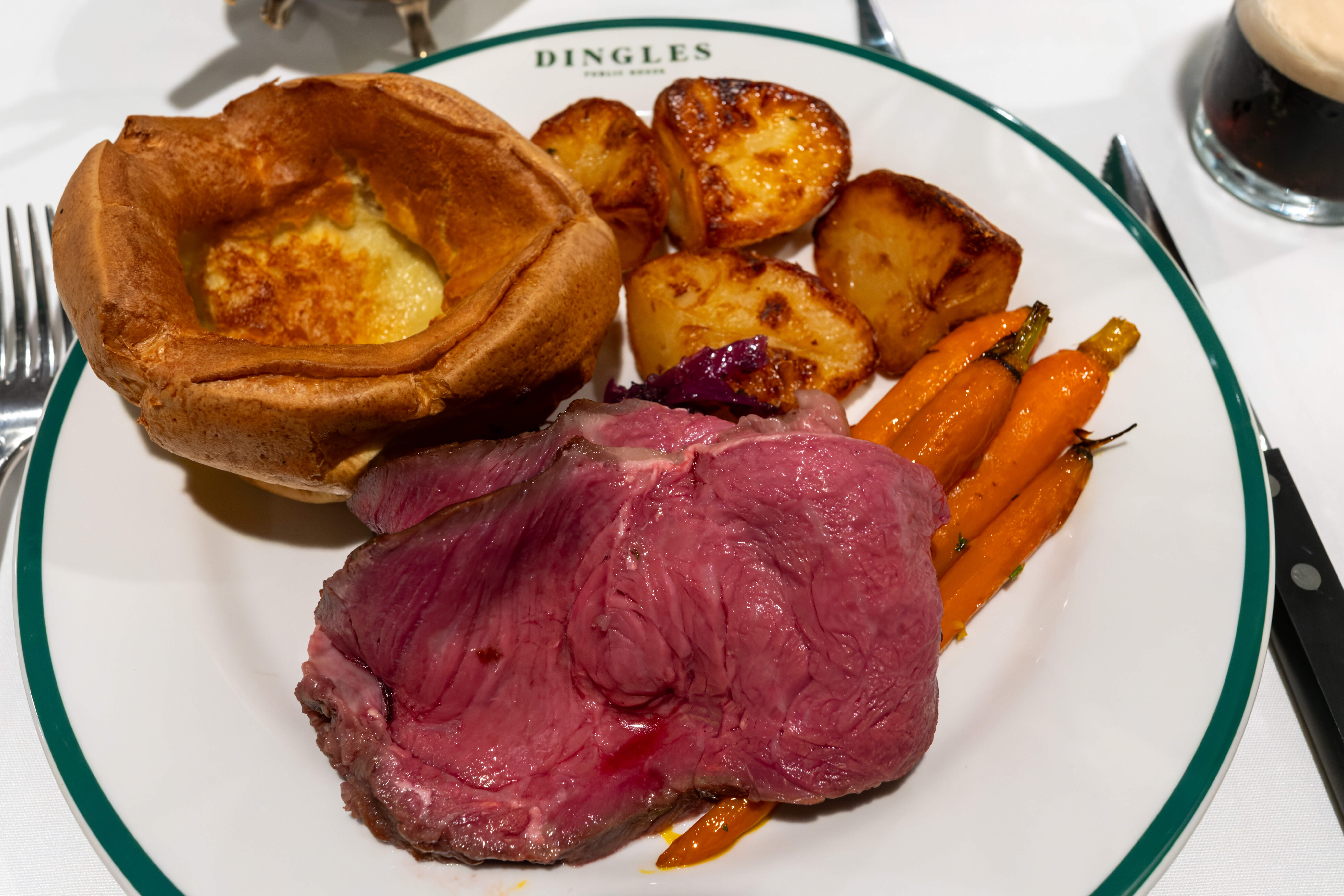 Roast Strip of Beef, Served with Yorkshire Pudding, Roast Potatoes, Honey Glazed Carrots, Braised Red Cabbage, Red Wine Gravy and Horseradish Cream ($58)