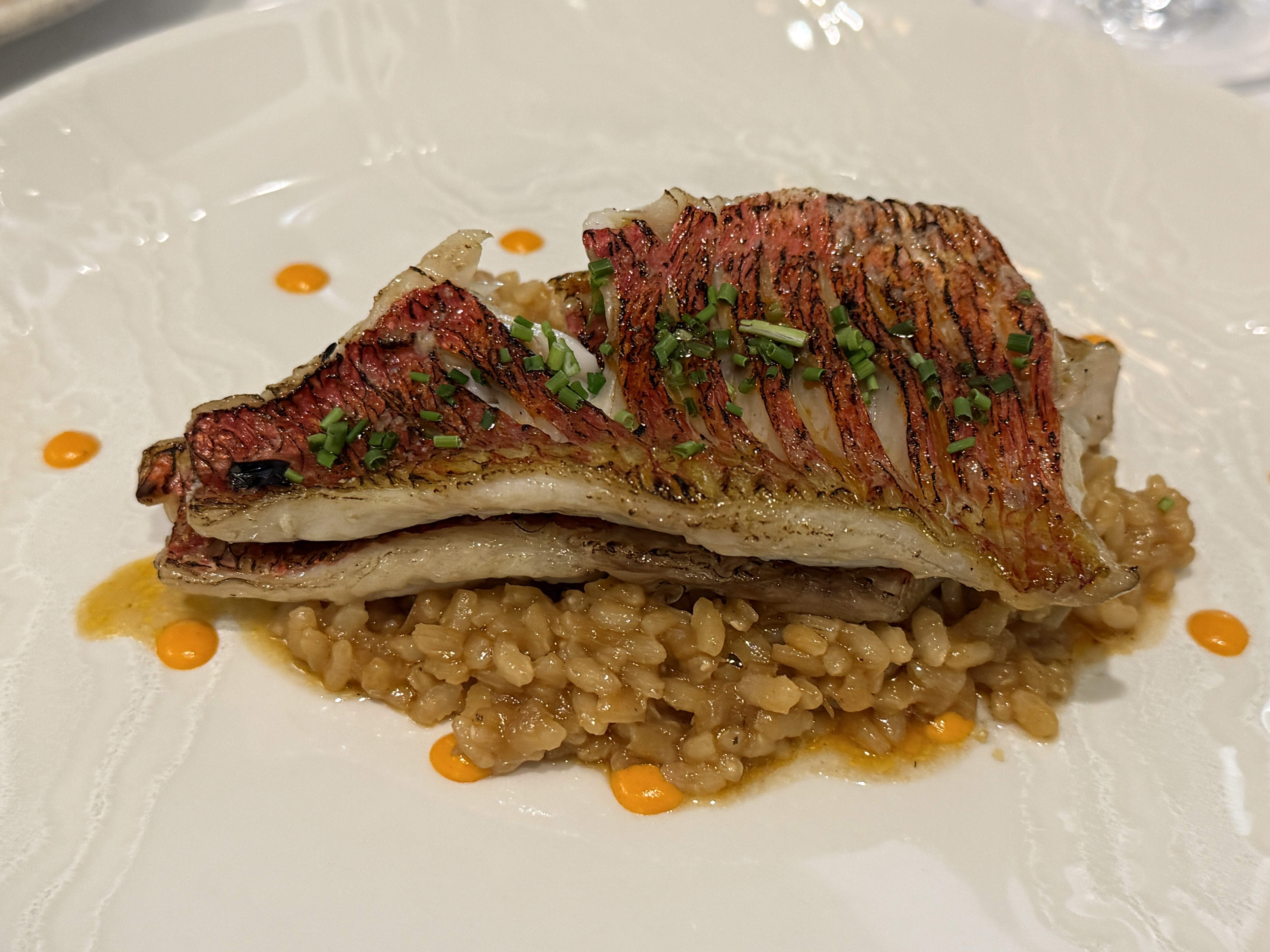 Red mullet over creamy rice