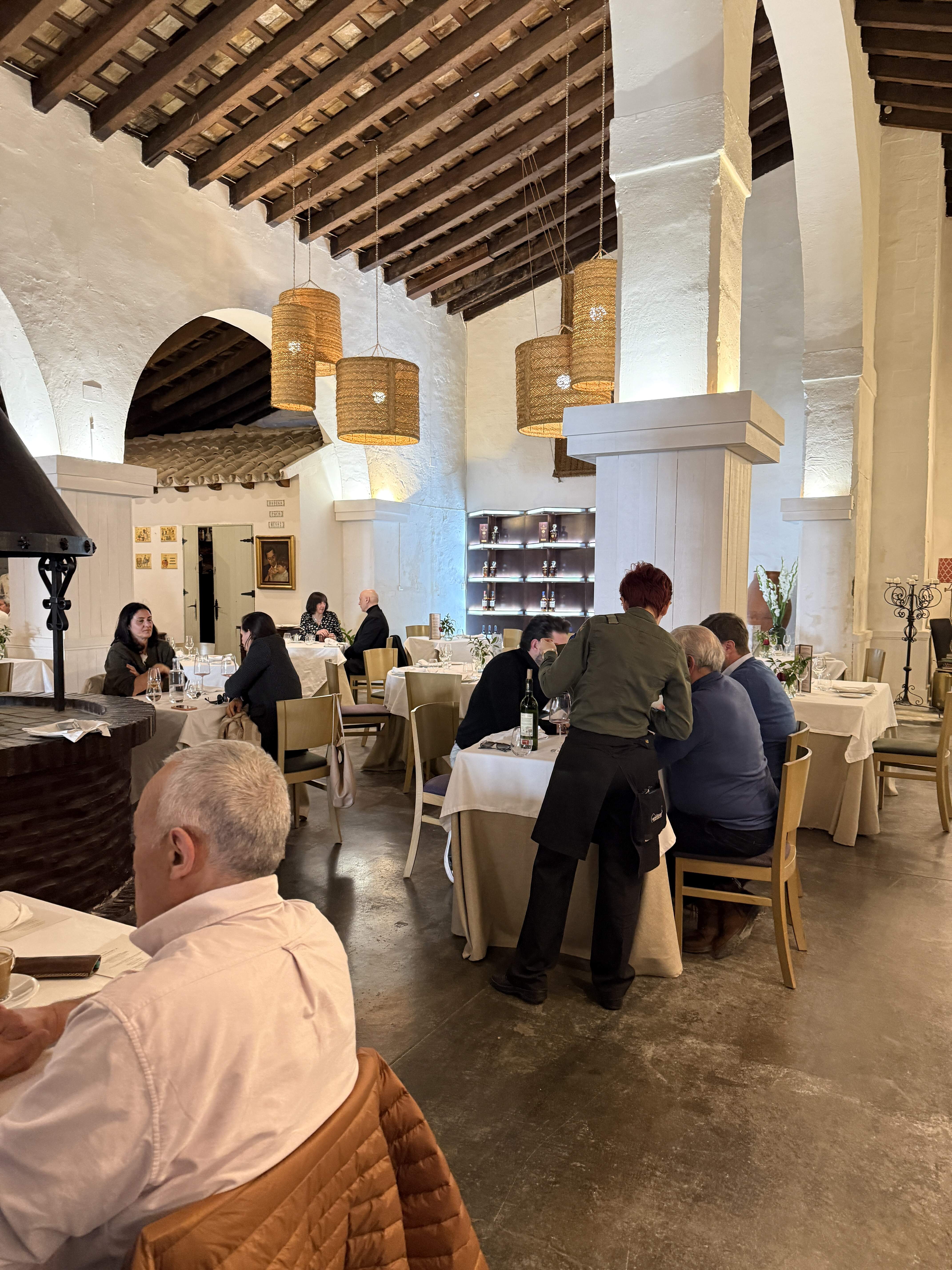 La Carboná has been our consistently favorite Jerez dining destination. It’s housed in a beautifully decorated former 1898 sherry warehouse with soaring wood cathedral ceiling from which hang giant lamps made of esparto grass, lovely antique furniture pieces adorn the space, with impeccably dressed and well spaced tables, and in the center sits a large circular fireplace.
