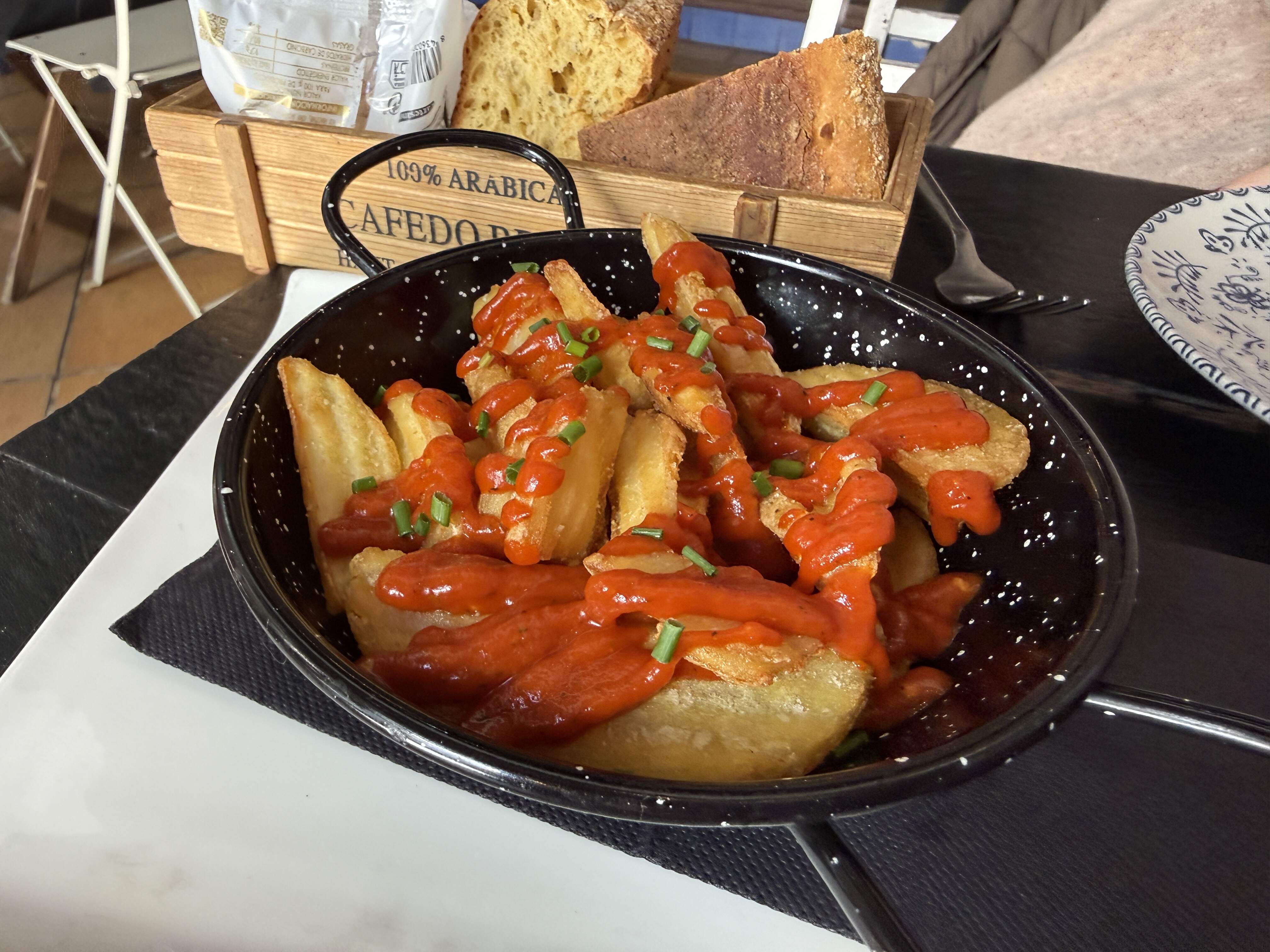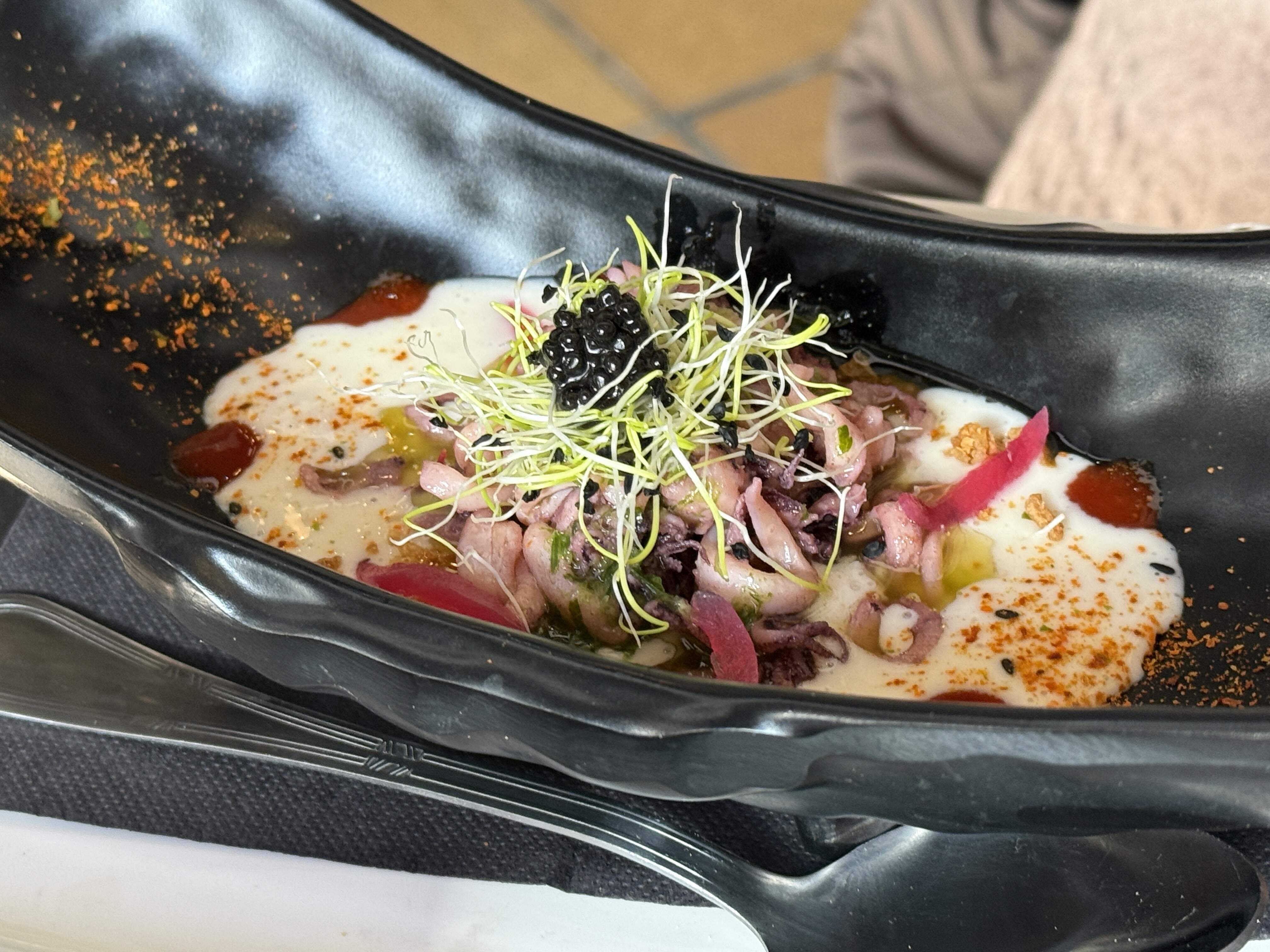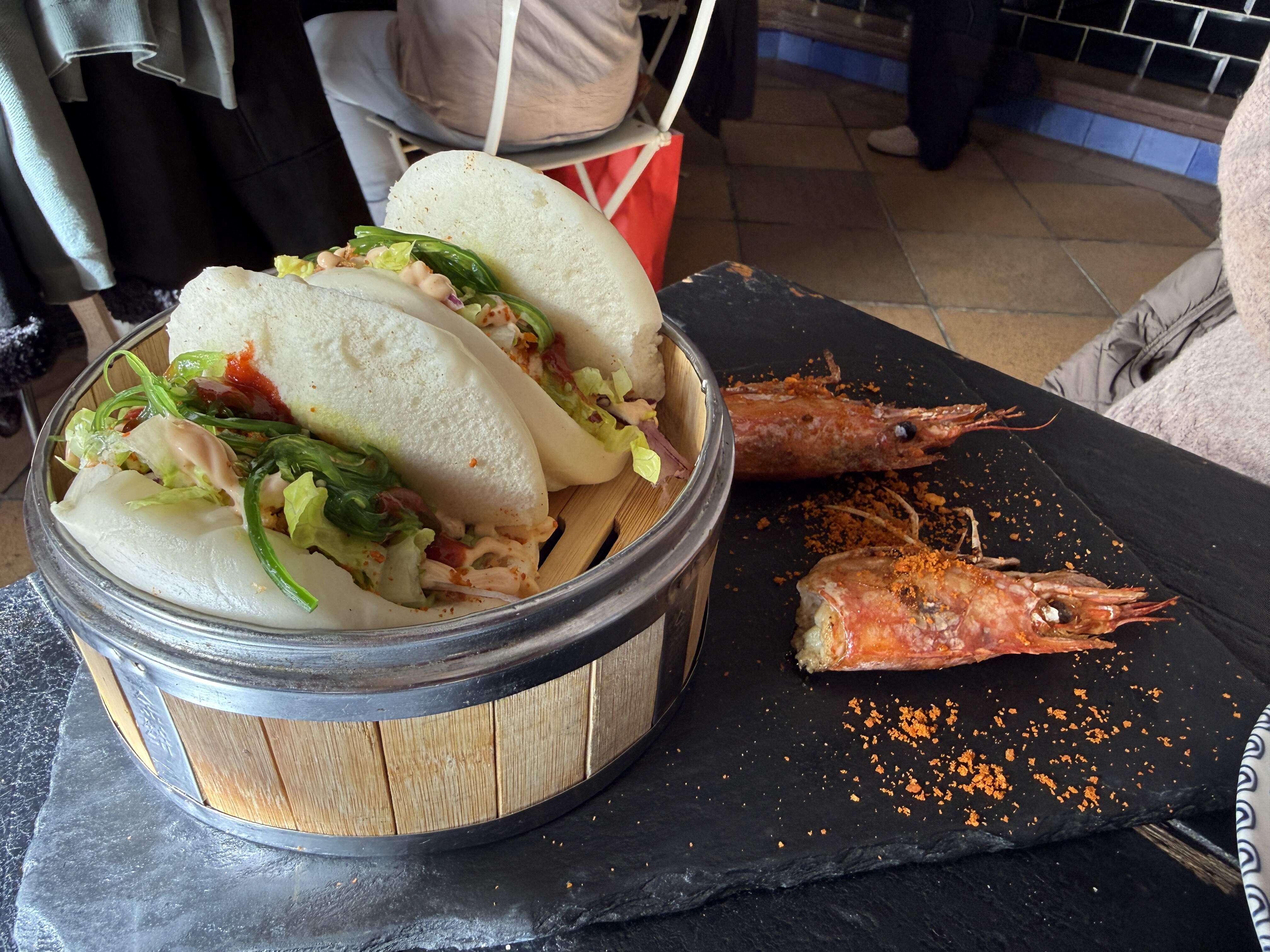 We opted for their spicy, signature papas bravísimas, Moroccan lamb skewers with almond cous cous, a nest of wok-fried squid atop white garlic with coconut milk, and a tasty bao, filled with large shrimp sauteed with red curry and served with kimchi alioli.