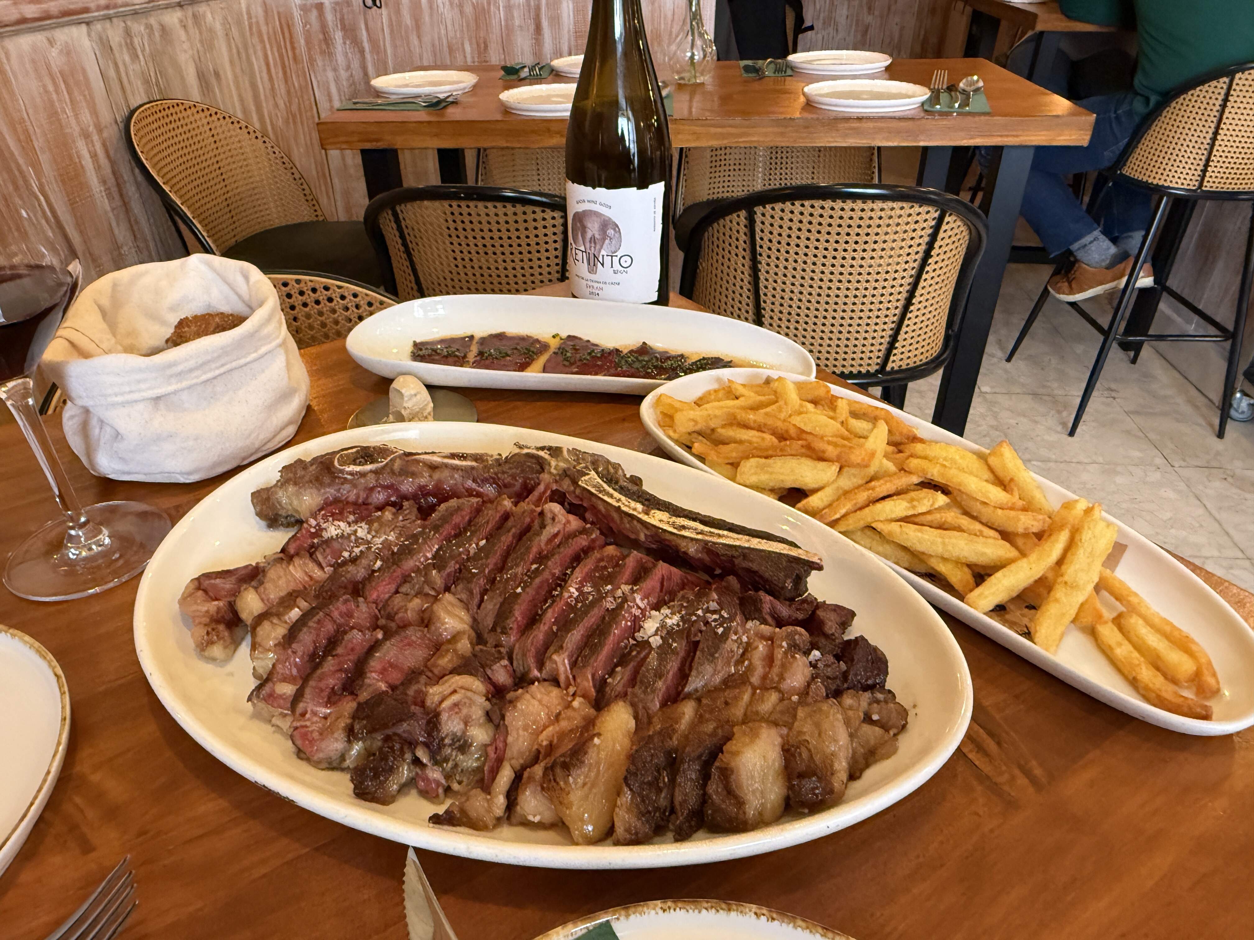 We began with excellent Panadería La Gallina Violeta corn bread from the served with anchovy butter, then Navarran lettuce hearts, cogollos, served with a caper cream, picatostes, shavings of Villaluenga payoyo cheese and dressed with roasted garlic oil, followed by a txuletón with sides of French fries and roasted Piquillo peppers (but the beef was not Basque nor local retinto but instead frisona from Holland*)* and as in the Basque Country, served very rare, what we’re used to but may be too rare for some. We finished with a warm chocolate cake covered with marscapone and salted toffee.