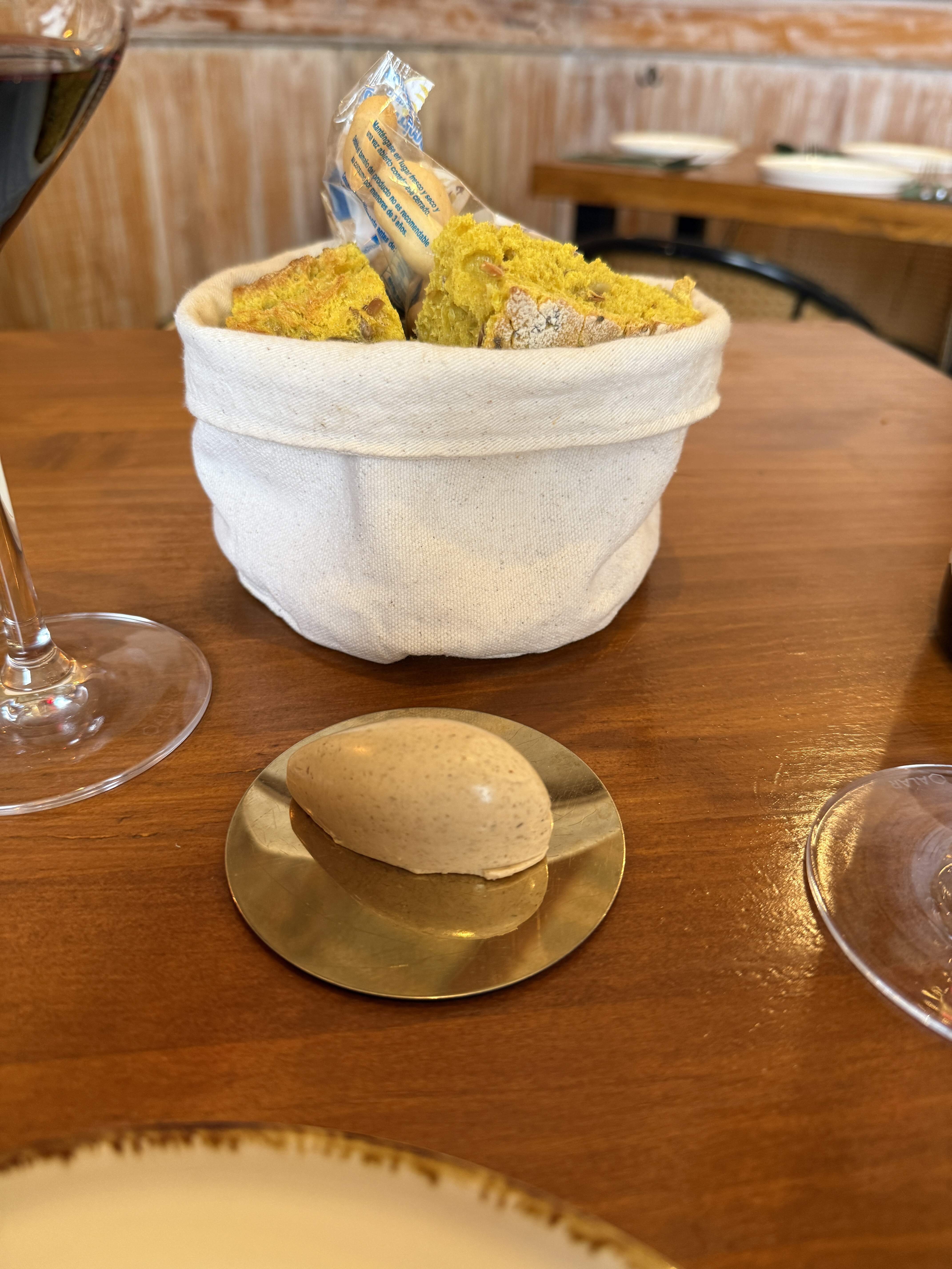 Presented first: the amuse bouche, a paté de ave, with an oloroso glaze along with excellent breads baked with a manzanilla yeast strain, a velo de flor.
