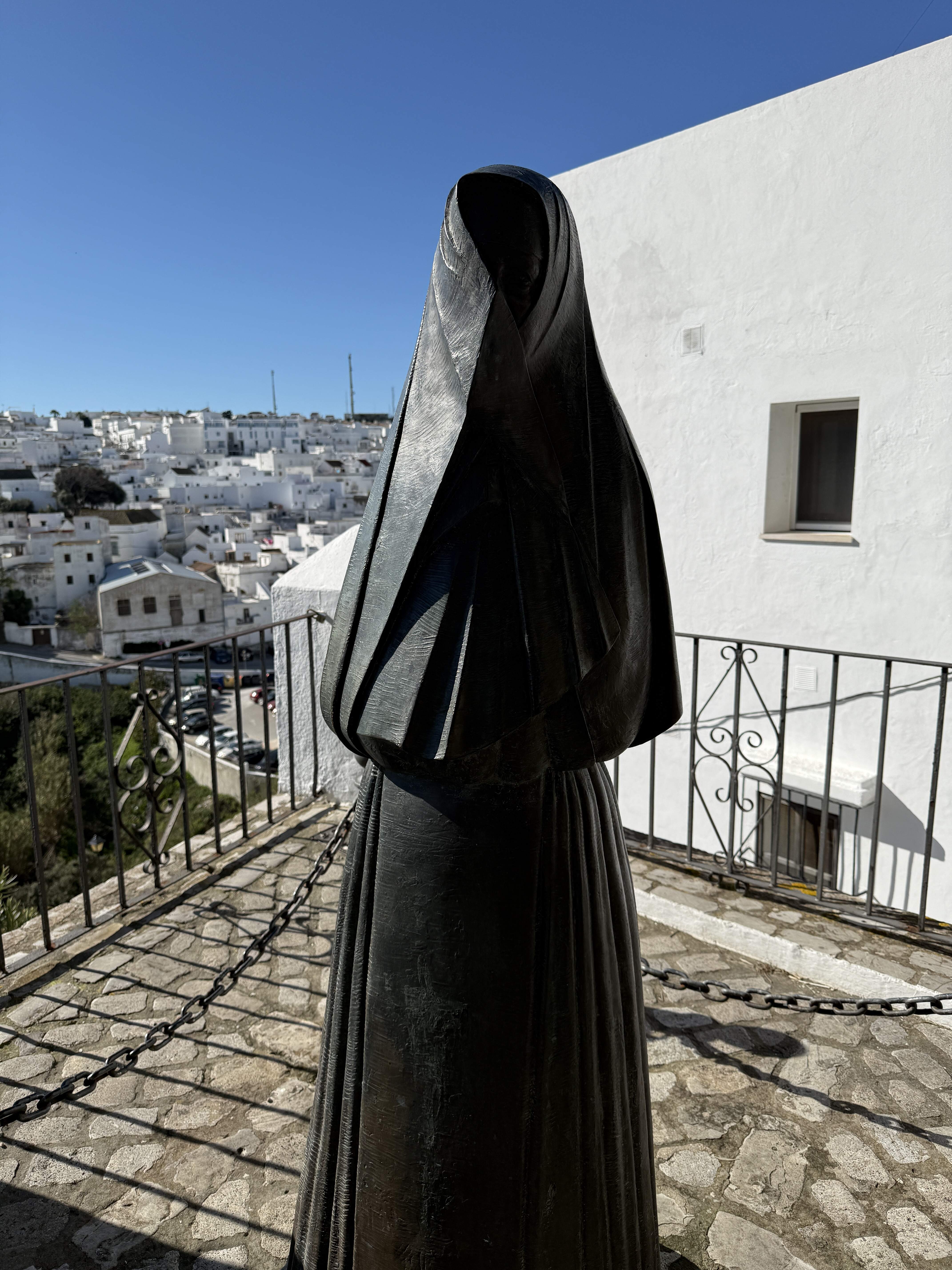 The statue of the cobijada, the ancient, traditional Vejeriega’s costume covering one eye (not a burka)