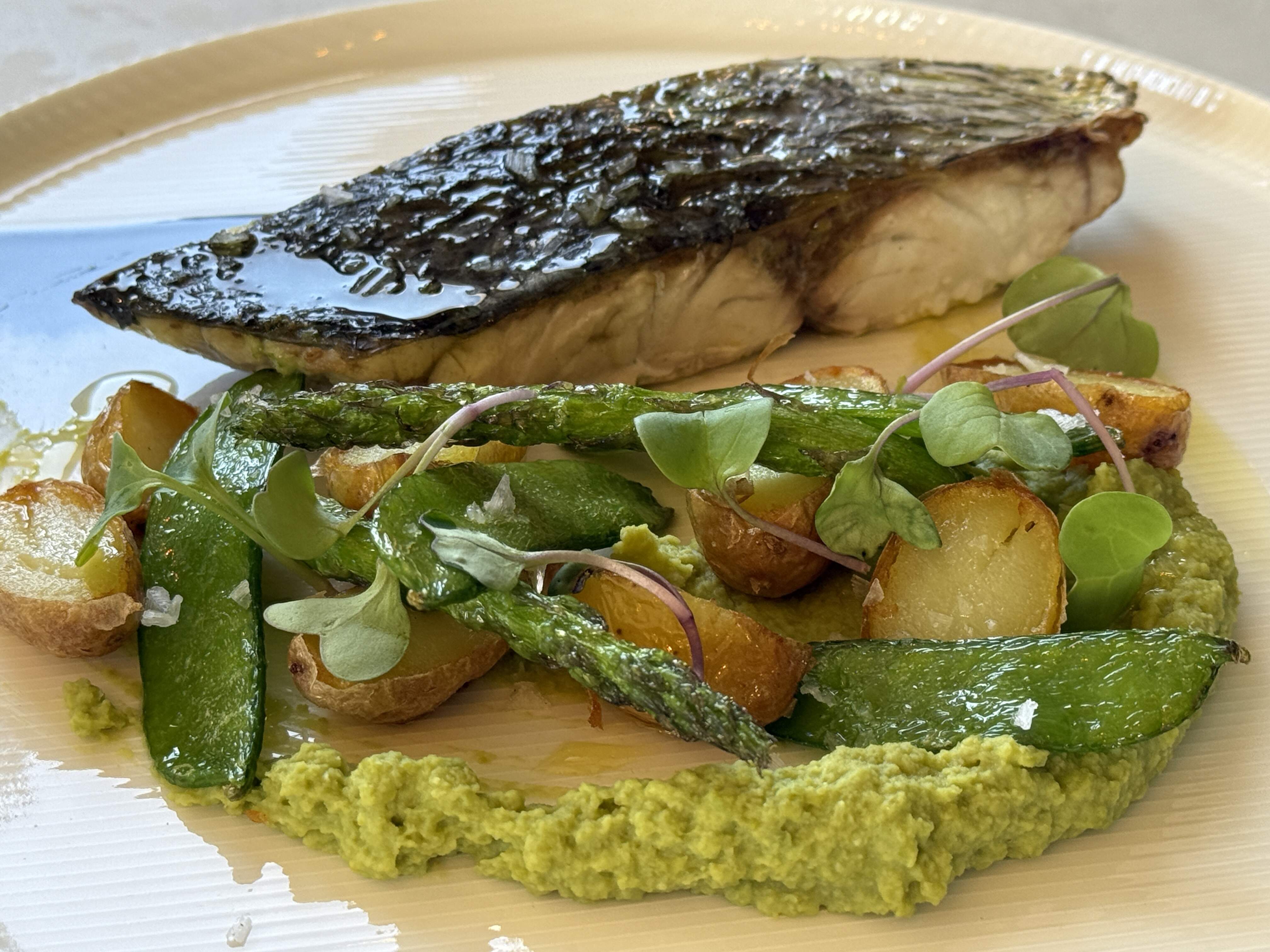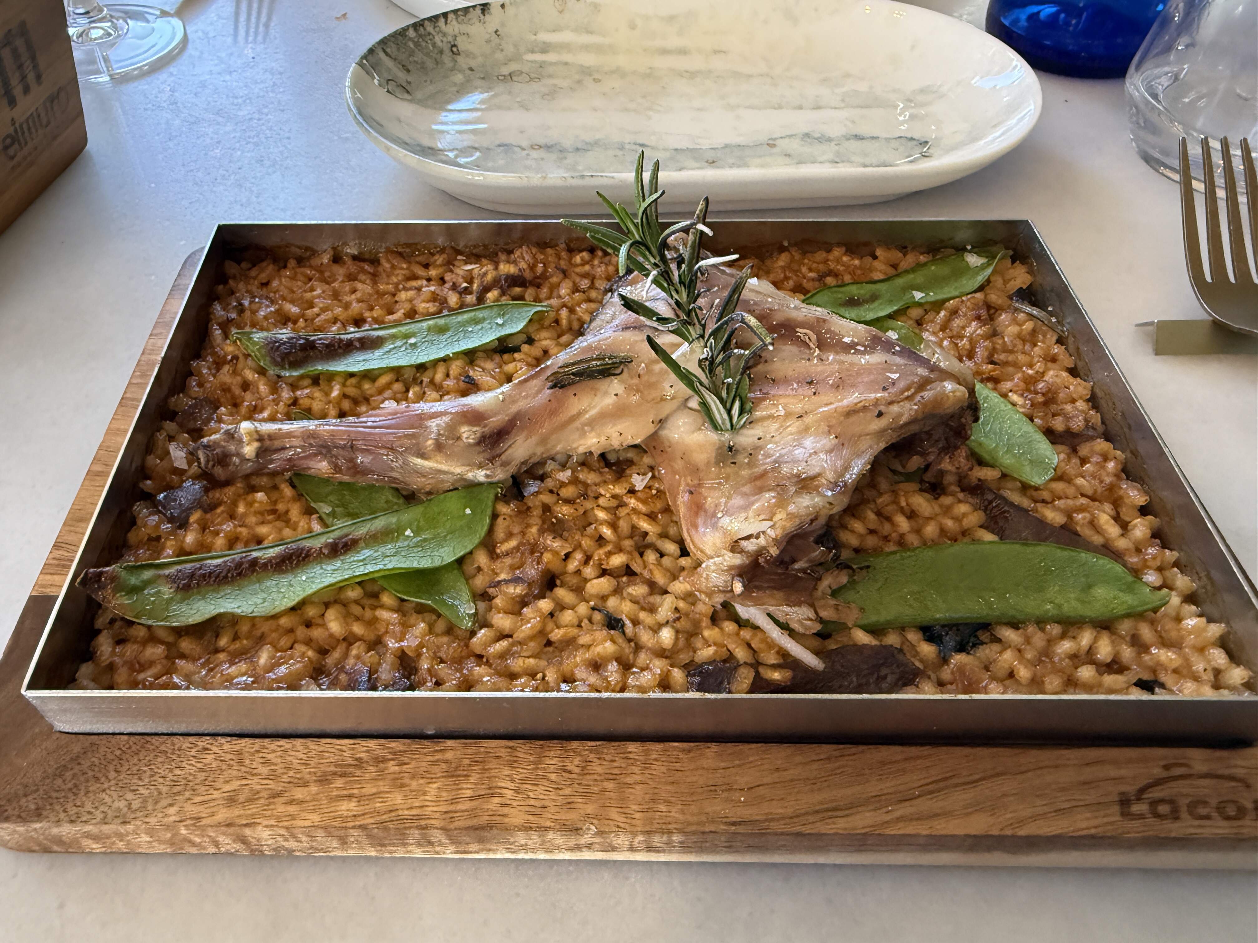 We were presented a simple amuse bouche of carrots in escabeche, and excellent local bread. We shared a starter of clams and shrimp in a delicious broth (but suffering from a bit of sand) served in local white pottery, and for our 2 mains, a creamy rice, prepared with the Molino Roca variety with a quarter front leg of rabbit, served in a llauna, a catalán rectangular metal pan (every day a rotating rice with wild game dish is offered) and corvina (sea bass) accompanied by local spring vegetables. For dessert: the warm payoyo cheesecake with artesanal orange ice cream. To drink: a bottle of Sobremar from Meridiano Perdido Viñedos, a vino de pasto, or unfortified sherry wine.