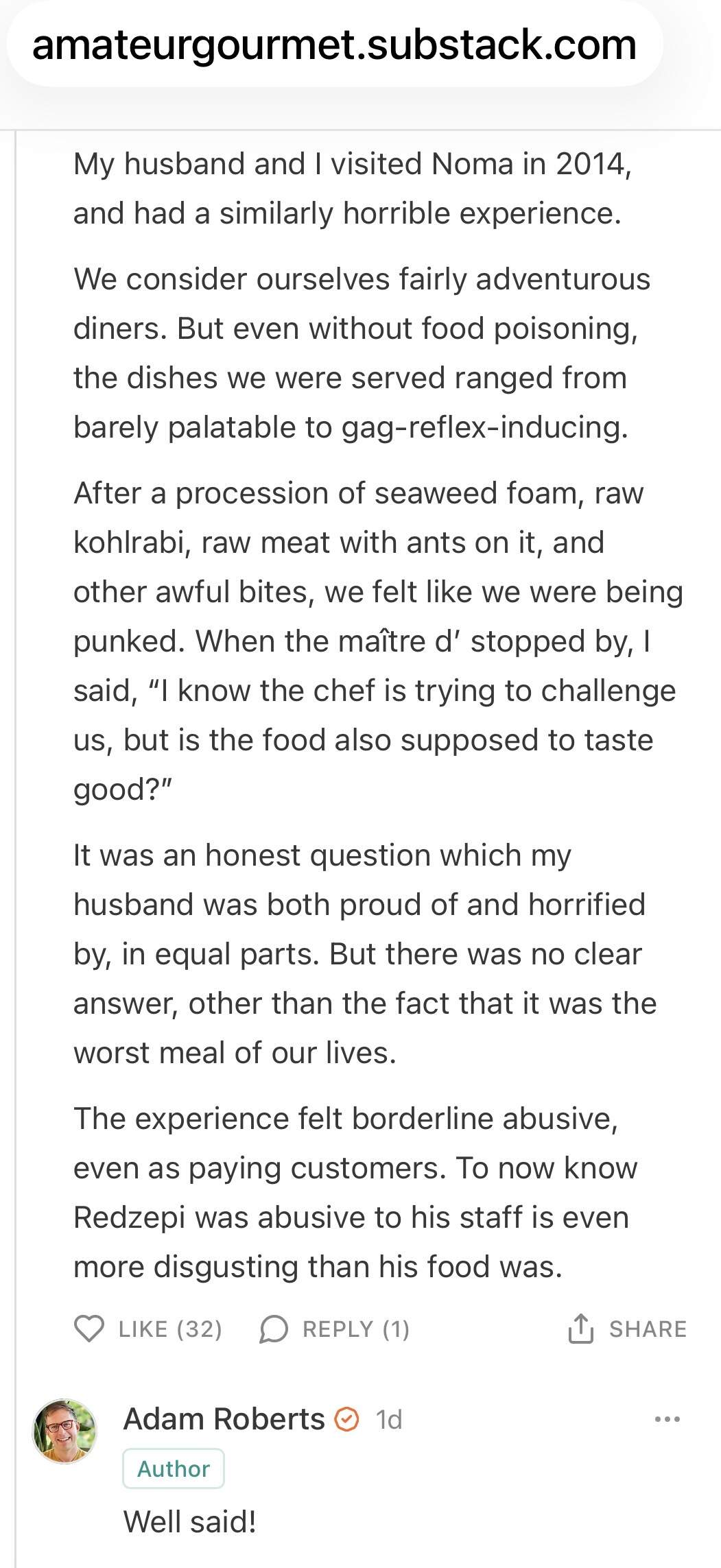 Thankfully I have not eaten their food. It’s a huge relief that I was never inclined to even consider it. But, mostly I am talking about what a toxic, exploitive monster their chef is and how he built an elitist empire through abuse, misery and torment. At this point the food could be made of angels and I wouldn’t care.