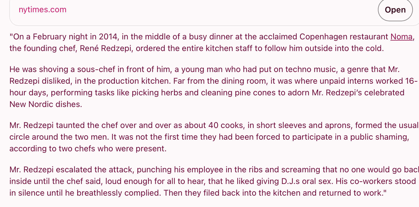 NYT didn’t suddenly find out about this in 2026. Nor in 2023, when Noma closed and everyone was singing paeans to Redzepi.