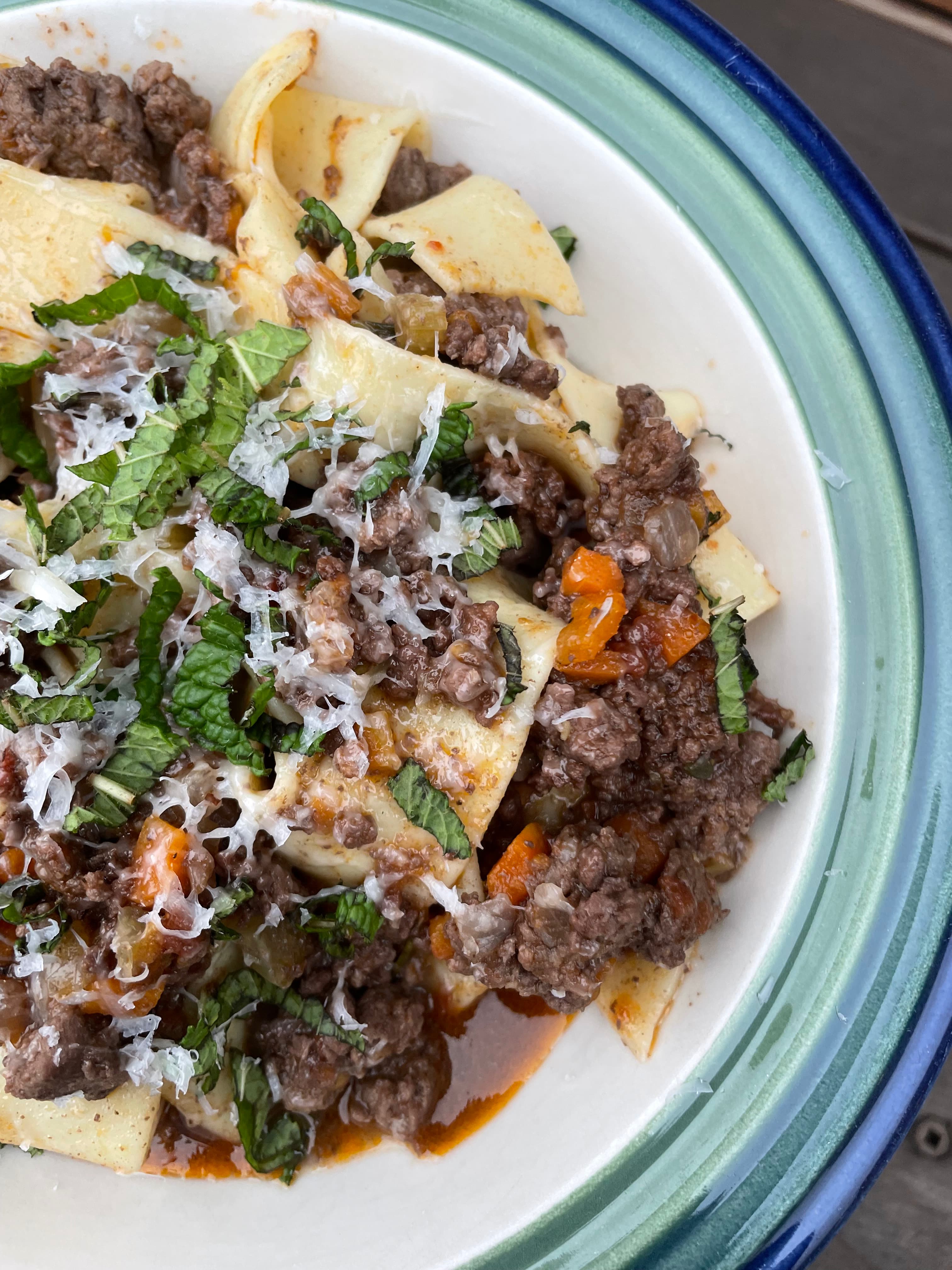 I don’t, however, love having pappardelle with these meaty sauces. First this shape takes forever to cook, which is annoying, but also even with elaborate effort, I can never get the sauce and pasta to marry. It just slides off the big broad noodle. You can’t get the perfect bite with both.