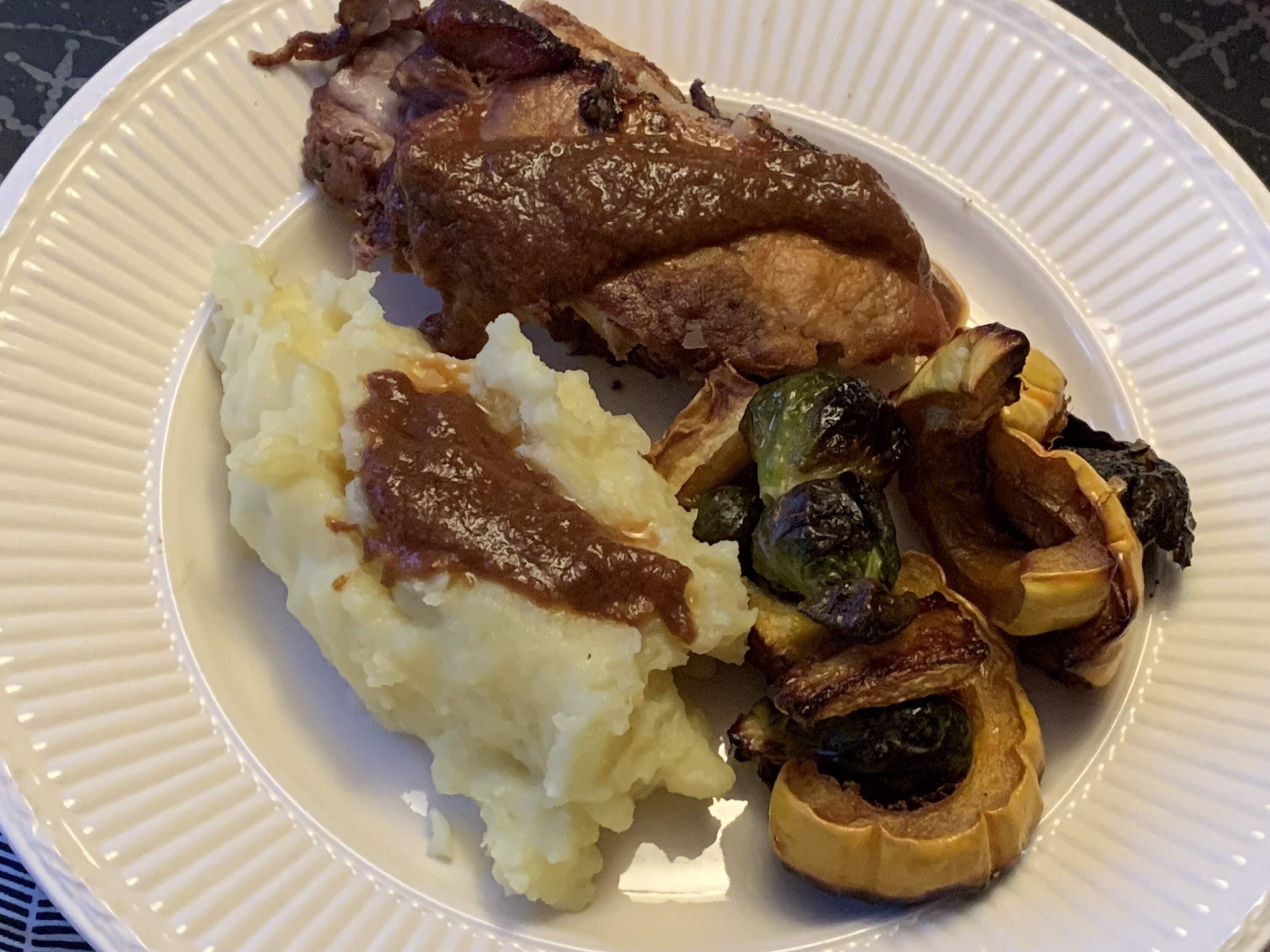 Our main for Christmas dinner was a riff on the Portuguese dish called cacoila, prepared with pork roast rather than the beef sometimes used. From a local farm I had purchased a cut that I learned is not commonly available around here, rather like pork shoulder (échine de porc) so it worked well as a braise. I really ought to have thinned out tasty, onion-thickened pan sauce—which I did do later, when we had leftovers.